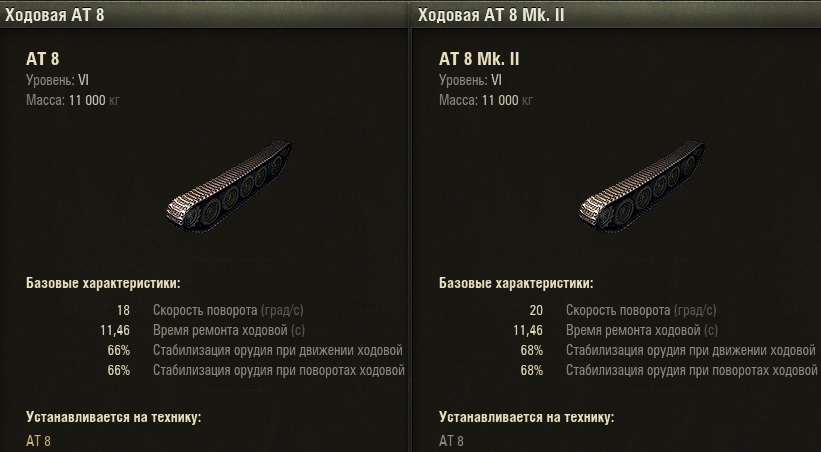 Наиболее востребованным универсальным оборудованием на данной машине может быть: турбонагнетатель, улучшенный механизм поворота, дополнительные грунтозацепы, досылатель, вентиляция и даже трубка(в первую очередь для альтернативного набора полевой модернизации для выбора на определенных картах). Потребность в турбонагнетателе просто очевидна, однако, даже выбор в его пользу даст нам максимальную скорость в 24 км/ч(трофейного - 25 км/ч, бонового 26 км/ч), все эти показатели нельзя назвать выдающимися, но все же это куда веселей базовых 20 км/ч. Очень желательно при выборе этого дополнительного оборудования использовать еще и такой расходник как 100-октановый бензин или 105-октановый бензин, чтобы наша динамика превысила хотя бы 11 л.с\т. Улучшенный механизм поворота и дополнительные грунтозацепы будут весьма кстати для решения проблемы неповоротливости данной машины, а первый из ранее указанных дополнительных модулей еще и улучшит стабилизацию орудия, которая у этой самоходки тоже далека от совершенства. Смысл использования орудийного досылателся очевиден, максимизация и так весьма неплохого ДПМ в стремлении к тому, чтобы на один вражеский выстрел ответить двумя, в то время как вентиляция может усилить данную машину по почти всему спектру характеристик. Хоть это может звучать странно для этой машины, но даже использование трубки может быть оправданно, особенно в случаях когда вы остаетесь один и тяните бой против нескольких противников, т.е. у вас есть возможность засечь противника первым и использовать весьма полезный прием в купе с точной и пробивной пушкой, связанный с зеленкой при случаях, когда вы своим выстрелом себя точно демаскируете, чтобы оставаться незаметным, сначала нужно встать в кусты так, чтобы они в снайперском прицеле были прозрачными, засветить противника, если нужно дождаться пока включится труба, затем быстро отъехать назад на расстояние 15 метров от куста так, чтобы кусты вновь стали непрозрачными и открыть огонь по противнику, так стреляя вы останетесь незамеченными для противника, повторять до уничтожения врага. Плюс с трубкой АТ 8 будет куда полезнее на открытых картах, вроде Малиновки, Прохоровки или Песчаной Реки, у машины есть определенные возможности благодаря точности орудия - играть в статичного снайпера, но лишь при оборонительных действиях. Главная проблема с этим доп. модулем заключается в том, что в вашем распоряжении должен быть очень хорошо прокаченный экипаж, ибо перк на маскировку при всех раскладах не является первоочередным, либо у вас есть возможность пользоваться предбоевой инструкцией "укрытие на местности". Однако, если у вас преобладает геймплей где во главу угла ставится игра исключительно от короткой дистанции, то в таких условиях наиболее важными и эффективными видами дополнительных модулей могут быть: улучшенная закалка, измененная компоновка, противоосколочный подбой. Так при выборе хотя бы одного из первых двух, вы максимально сильно снизите опасность для гусениц вашей машины, при выборе третьего хорошо защитите вашу машину от фугасов артиллерии, машин вроде КВ-2 или О-И, которые могут нанести огромный фугасный альфа урон. В добавок использование противоосколочного подбоя дает неплохие перспективы для размена аптечки на вторую ремку, особенно есл