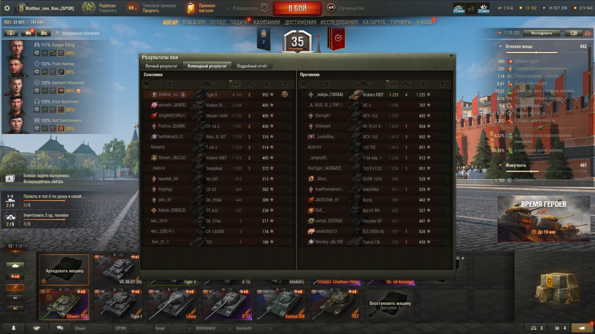 Когда только начинал играть в 2011 году - был первой 8 у меня. Сейчас решил выкачать 11 уровень, и пошел через ветку Е100. Тигр 1 хороший аппарат. Вообще не страдал на нём. Но Тигр 2 - это какое-то кошмар. Единственный его плюс - это хорошая пушка. И на этом всё. Неоднакратно пробивался в ВЛД Шкодой Т56 с её 208 пробития. Да и не только Шкодой. VK 45.02 (P) Ausf. A с его 200 пробития в упор пробивает ВЛД. Толком не танкует короче. В век фулголды, турбочей, и барабанов - машина без брони почти не реализуема. Играть в поддержку из-за спин "союзников" почти невозможно при разнице 4-5 живых машин в пользу соперника. Ветка Т110Е5 куда проще проходилась. Советские двухстволки лучше будут как по мне. Ветка Тапка была приятнее. При условии, что сейчас 1.36.1 и есть +- 1 уровень - я не предствляю как он с 10 играется. Изменено пользователем SAIBERN