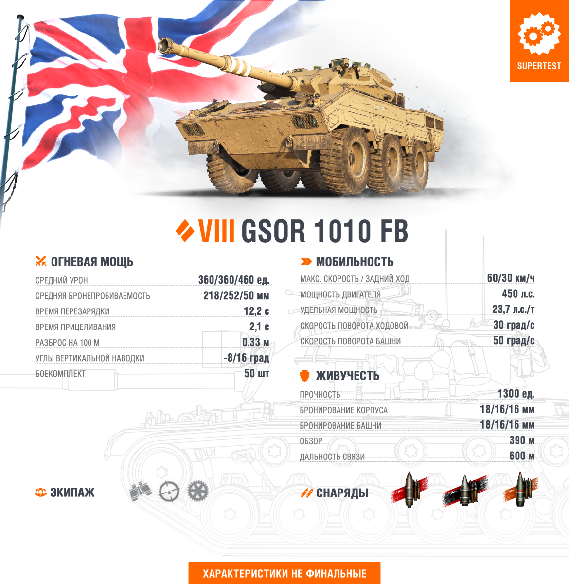 Разработчики FlushDraw Опубликовано: 13 апреля, 2023 Разработчики 5 710 публикаций 24 321 бой Разработчики Жалоба Поделиться Опубликовано: 13 апреля, 2023 (изменено) Всем привет. В нашем проекте готовится к выходу новая ветка колёсных средних танков Великобритании. Игровая концепция ветки – крупногабаритные средние танки на колесных шасси. Благодаря колесным шасси эти танки будут обладать отличной подвижностью как для средних танков. В угоду достижения максимальной подвижности корпус машин облегчен и практически лишён защищённости. Машины будут иметь очень комфортные орудия с отличным разовым уроном и высокими показателями точности и скорости сведения. Первым представителем новой ветки, который отправится на супертетст будет новый премиум танк GSOR 1010 FB, который будет обладать всеми основными характерными чертами ветки британских средних танков: комфортное орудие, отличная подвижность, особенности новой механики колесных шасси. Машина будет вооружена 105 мм орудием время перезарядки составит 12.2 с. Бронепробитие основного снаряда — 218 мм, специального — 252 мм, разовый урон – 360 ед. Точность — 0,33, время сведения — 2,1 с. В лобовой проекции броня танка достигает 18 мм. Максимальная скорость машины равна 60 км/ч, удельная мощность — 23,7 л.с./т. Общая прочность —– 1300 ед. Обзор – 390 м. Об особенностях механики «Колёсных средних танков» Новые колесные средние танки объединяют в себе особенности существующих в игре легких французских танков и классических гусеничных танков. Как и легкие "колесники", британские СТ обладают отличной динамикой (сравнимой с таковой у легких танков) за счет высокой удельной мощности, а также могут развивать высокую максимальную скорость как вперед, так и назад. Это поможет им занимать ключевые позиции на карте в первые минуты боя. В то же время их подвижность не дотягивает до уровня колёсных легких танков, что заставит игрока заранее продумывать пути отступления. За счет конструктивных особенностей колесной ходовой новые средние танки обладают возможностью разворота на месте и поворотов на малой скорости. Это одно из основных отличий этих танков от колесных ЛТ, которые не могут развернуться на месте. В то же время на средних и высоких скоростях британцы на порядок уступают французским колесным ЛТ в маневренности. Иными словами, резко менять направление в движении на высокой скорости как на EBR не получится. Но долго привыкать к такому поведению не придется - так ведут себя многие существующие в игре танки, например, Bat Chat 25t. К тому же, с точки зрения игрока, управление такими машинами в ближнем бою будет интуитивно простым и не требующим дополнительных навыков игры сугубо на колёсной технике. Следует также помнить и о больших габаритах и гораздо худшей маскировке по сравнению с колесными ЛТ. И хотя за счет отличной подвижности и хорошего обзора в определенных игровых моментах можно будет активно подсвечивать врага, отыгрывать роль полноценного светляка на новых колесных СТ не получится. Изменено 13 апреля, 2023 пользователем FlushDraw 5 Ссылка на комментарий Поделиться на других сайтах Другие способы поделиться...