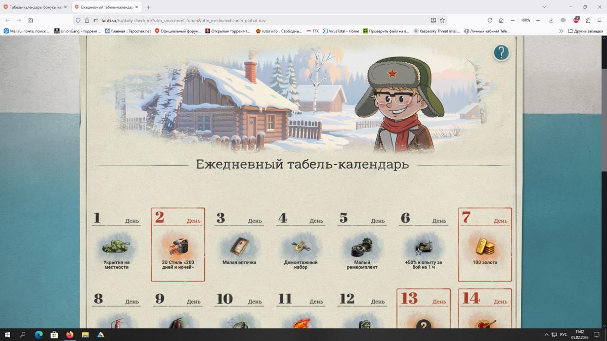chipcard Опубликовано: 7 февраля Игроки 17 848 публикаций 55 052 боя Жалоба Поделиться Опубликовано: 7 февраля 06 фев 2026 - 22:42 пользователь taleyko20 сказал:Табель - календарь, это Отличные ежедневные плюшки, которые я каждый день, забираю! ! Спасибо! Так держать! Стоп! Снято! Пройдите в кассу за гонораром Ссылка на комментарий Поделиться на других сайтах Другие способы поделиться...