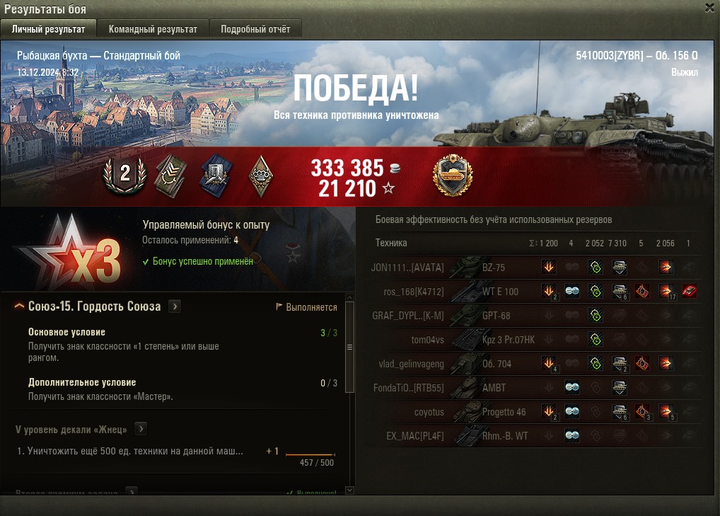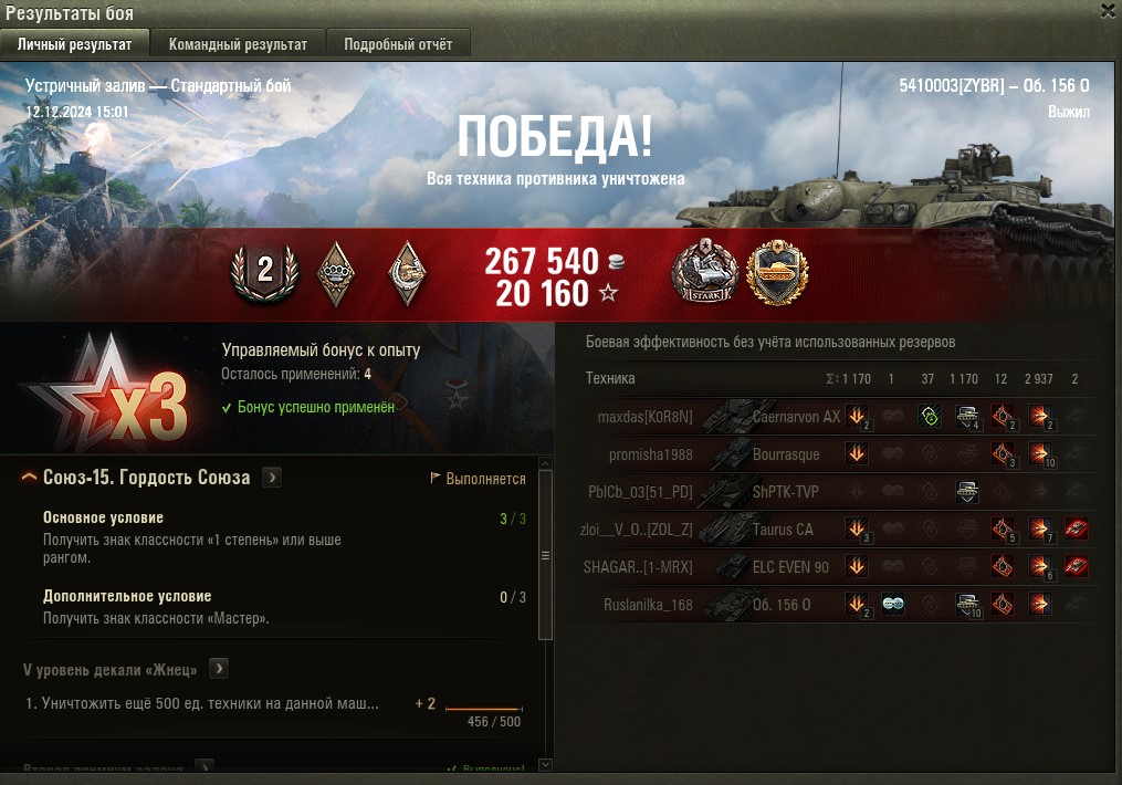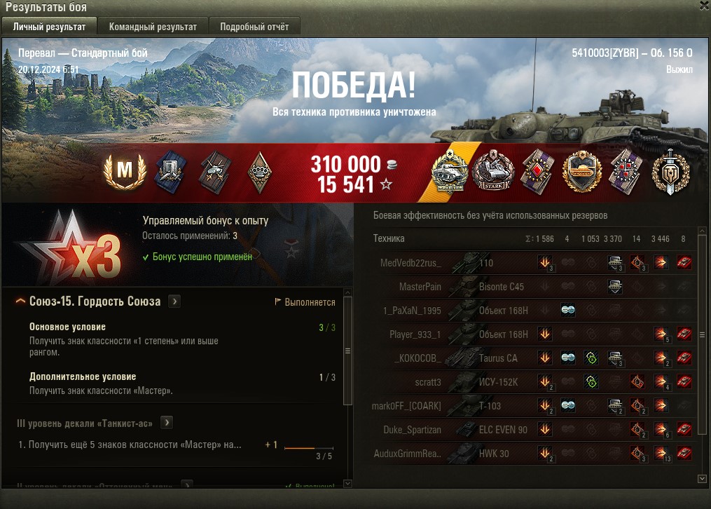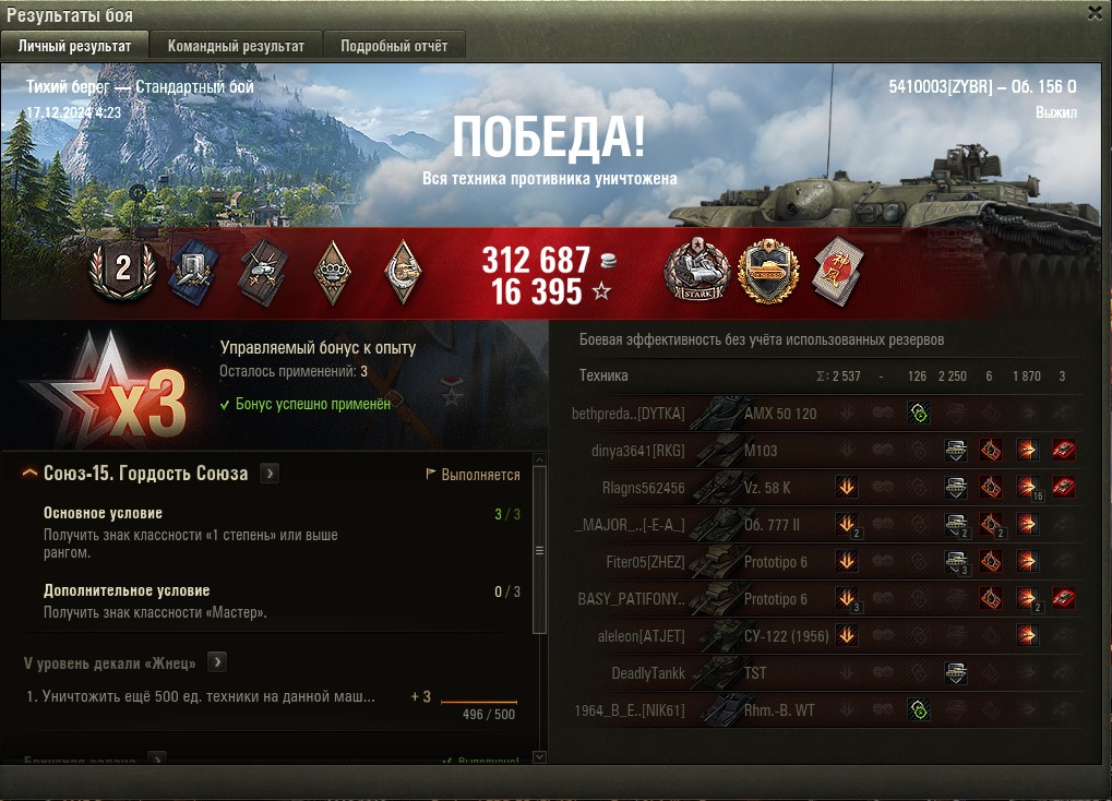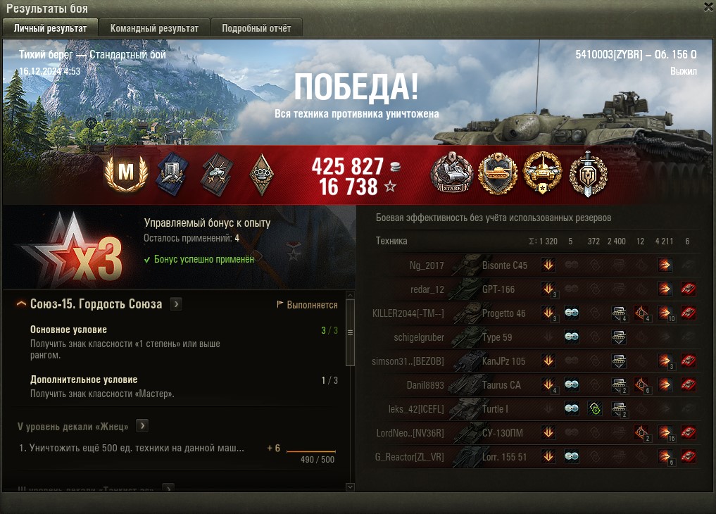 Сегодня выдался приятный мастер. Долгий равный бой, сбит захват базы, 1959 чистого опыта, 5 фрагов, 415к серы.