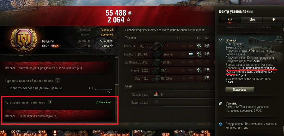 betonger Опубликовано: 23 августа, 2023 Игроки 183 публикации 54 542 боя Жалоба Поделиться Опубликовано: 23 августа, 2023 23 авг 2023 - 08:53 пользователь RenamedUser_4375246 сказал: Там где личный результат смотри. Путь зубра испытание боем - далее награда чуть ниже сноска Личный результат такого нет в ангаре, в задачах? в задачах написано только выполнено и все. В общем я так понял нет никих наград. Все награды были в сообщении результата боя справа внизу, но и там нет. Ссылка на комментарий Поделиться на других сайтах Другие способы поделиться...