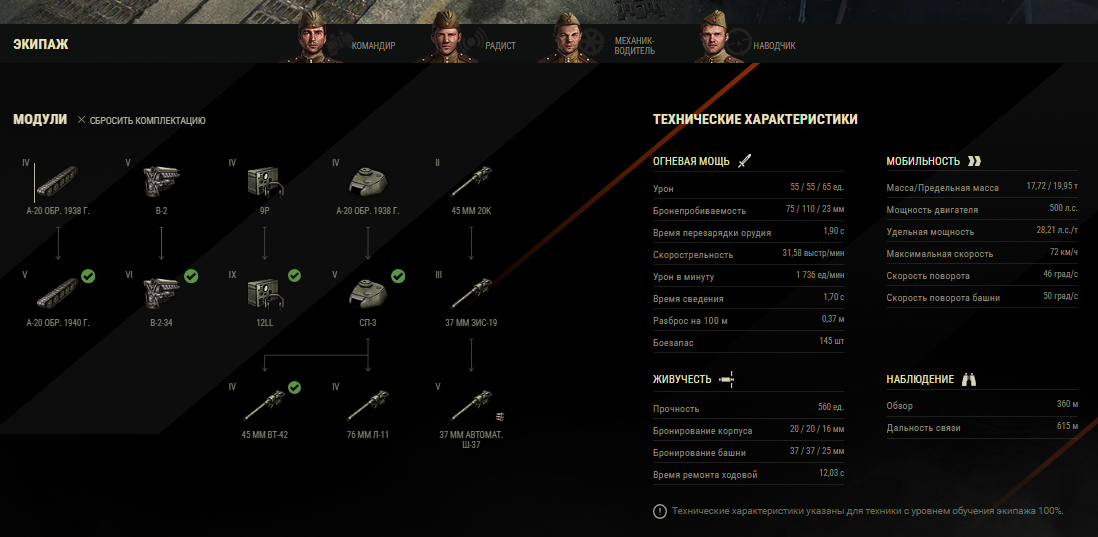 • В первую необходимо усиливать огневую мощь и обзор. Соответственно необходимо прокачать башню СП-3 (2215 опыта) и орудие 45-мм ВТ-42 (850 опыта).