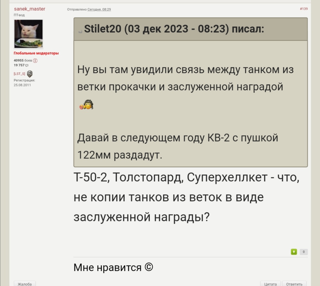 Assatom Опубликовано: 3 декабря, 2023 Игроки 1 970 публикаций 56 948 боёв Жалоба Поделиться Опубликовано: 3 декабря, 2023 Леста зачем же вы ломаете стереотипы людей! Вы назвали этот танк тяжелым, при этом масса у это танка 41т всего, по классификации немцев это всего лишь средний танк! И он ничего не имеет от тяжелого танка, ни мощного орудия с большим калибром, ни брони! Кстати все лт 6 уровня пробивают бб куда угодно в лобовой проекции, при этом они быстрее и маневренней и легко могут закружить! Вот теперь поясните, зачем вы раздали это недоразумение? Чтоб куча игроков шли жаловаться на форум, что танк ничего не может против одноклассников? Или это ваш хваленный баланс, которого что то не наблюдается! Ссылка на комментарий Поделиться на других сайтах Другие способы поделиться...
