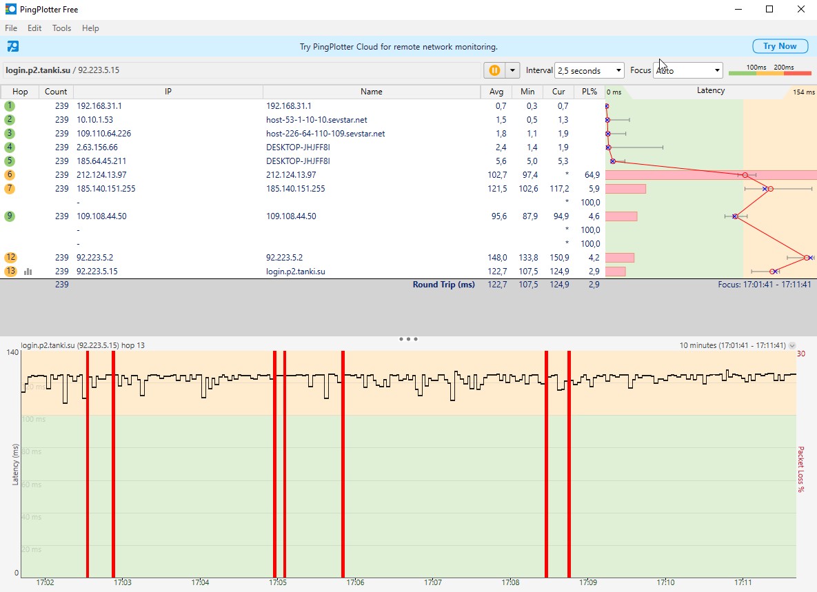 Глобальные модераторы ZloyBut Опубликовано: 25 декабря, 2023 Глобальные модераторы 48 312 публикации 45 510 боёв Глобальные модераторы Жалоба Поделиться Опубликовано: 25 декабря, 2023 25 дек 2023 - 19:57 пользователь Dronger сказал: И от меня примите. Роутер перезагрузил, всё закрыл и запустил чек аж на час на ру1, так как там в основном и играю. Ничего в этом не шарю. Что скажет расшифровка? login.p1.tanki.su(25.12.23).gch 1,88МБ Сильные Потери на промежуточных узлах трассы.На рисунке видно где.Это магистрали и местные провайдеры вам не помогут.Вам остается только ожидать исправления ситуации. Видимо идут какие-то техработы на трассах.Если завтра днем проблема не уйдет - создайте новый отчет (только с Расширенной сетевой диагностикой пары серверов) и прикрепите его к новому посту. Spoiler Ссылка на комментарий Поделиться на других сайтах Другие способы поделиться...