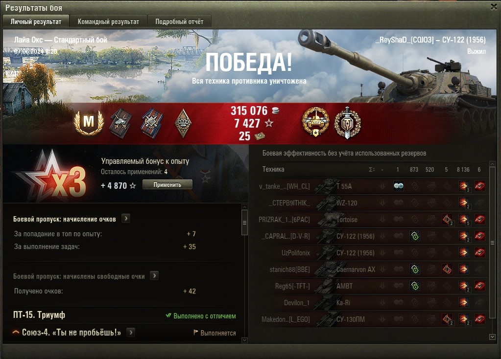 17 боёв за три подхода, утро, день, вечер. Если бы я катал, как ты, по 5 боёв, то ПП был бы около 10-11 прц, потому что первые десять боёв максимум, одна- две победы. Так уже довольно давно. Зато потом пачками победы при турбачах. Я предпочту поражение при настреле таким победам