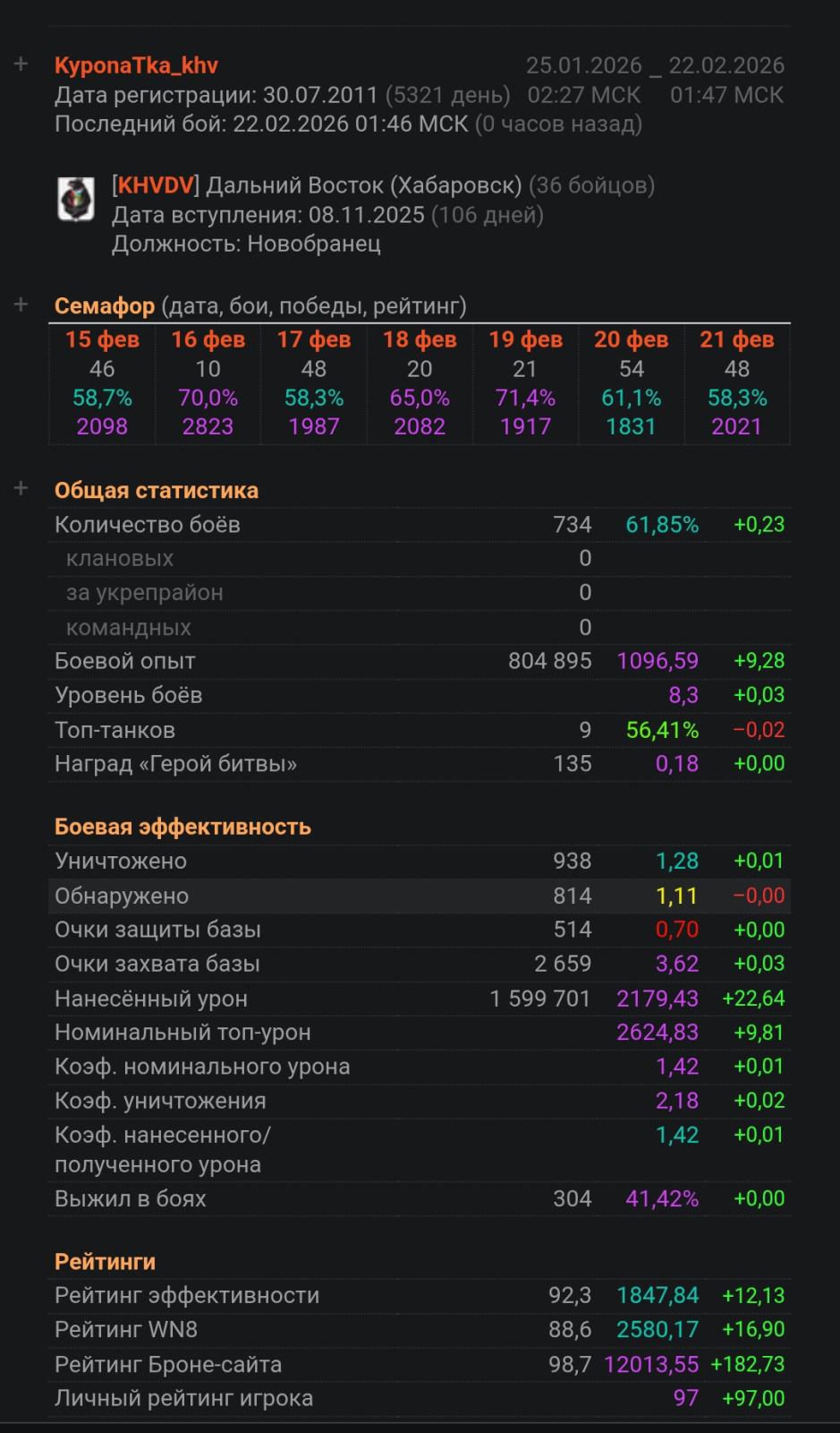 _Koshej_ Опубликовано: 21 февраля Игроки 23 016 публикаций 61 874 боя Жалоба Поделиться Опубликовано: 21 февраля 21 фев 2026 - 23:47 пользователь KyponaTka_khv сказал:Засыпает город, просыпается Куропатка. Друзья, что-то я давненько не выкладывал свои победные сессии, поэтому спешу поделиться с вами. Вот пожалуйста. Ничего необычного, всё по стандарту.Пис оф тэнькс рейтинг - 10kСредуха - 2200Победы - 58%. (К сожалению, не дотянул до своего психологического винрейта в 65%) Ну и ладно, потом отыграюсь. Поглядим, что там на дистанции. Тоже всё ок. Последние 734 боя - почти 62%.Ну тут понятно, просто повезло с командой. Далее идет парочка моих танков, вместо Арчибальдовых Тайпов. - У Капитана малость просел пп, но там и боёв пока на 17 меньше.- У Доппеля все показатели немного подросли. Объективно этот танк лучше из-за точности и скорострельности. Ещё набил 150 фрагов и Цейса подъехала в ангар, пусть стоит. Пока так. Если у кого-то появились какие-либо вопросы, задавайте. Только не все сразу, по очереди.Спасибо за внимание. Вопросы естьПочем там хибары во Владике, я переезжаю Достойна доля того кто правыйШирокий выбор, благое благоВершить заслоны, смотреть под ногиИ оставаться стерильным гостем Ссылка на комментарий Поделиться на других сайтах Другие способы поделиться...