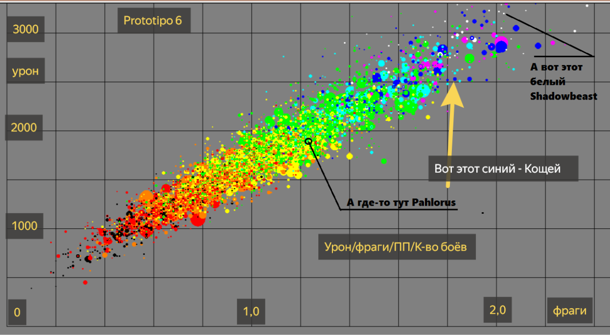 worster777 Опубликовано: 22 февраля Игроки 9 764 публикации 35 109 боёв Жалоба Поделиться Опубликовано: 22 февраля 21 фев 2026 - 17:41 пользователь KPOT2338 сказал:По горизонтали среднее количество фраговПо вертикали - средний уронЦвета - цвет побед по хвм (с дополнением)*Размер кружочка в пикселях - число боёв в сотнях* - Как понял по графику, у Шадовбеста дамаг где-то 3300, чуть более 2 фрагов и мало боёв. Голда - это выдуманная проблема. Я, средний игрок, которых в нашей любимой игре 99%. С момента регистрации, на бебешках и без пайков, играл в 1700 среднего на десятках. Три года назад начал играть на фулфарше, результаты около 2200. Ну не такое сильное влияние голда оказывает на геймплей, а статисты и на бебешках будут делать такие же результаты, как и на фулголде. (с) gentleman_v_labserdakehttps://vkvideo.ru/v...56259581?t=4m0s Ссылка на комментарий Поделиться на других сайтах Другие способы поделиться...