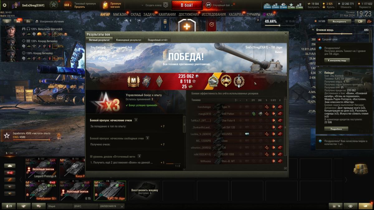 Ну тут спорно кнш. В теории Т95, но только на некоторых картах. Плюс, Т95 все видят и никто под него особо вылезать не хочет. Ибо фиг пробьешь, да и получать на 750 нет желания. А ягер из засады пыщ-пыщ. Ну и хлопушка у него по 390 пулькает, не так страшно выкатиться и втащить. Ну и динамика оч. сильно решает в набивании опыта. Условно, в выигранном бою я поеду и еще арту перережу, т.к. скорость позволяет, ну и в целом на фазе добивания намного больше шансов накидать.
