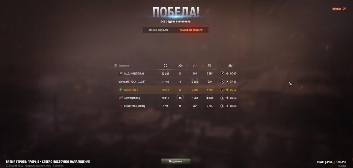 s4orm Опубликовано: 7 мая, 2025 Игроки 1 170 публикаций 9 104 боя Жалоба Поделиться Опубликовано: 7 мая, 2025 Режим проходиться несложно, вторая часть муторная, но не сложная, кроме карты Берлин. Если попадёте на Берлин можно смело забивать болт. Там в конце выезжает два Мауса и вы на ИС4 ничего сделать им не можете. Почти фуловая по здоровью команда слилась в ноль за пару минут. ИС2 даже доехать не успевал, разбирали вне зоны видимости ботов. В остальном режим проходиться за пару вечеров. ИС парадный, если не кидает к восьмёркам вполне неплох. На скрине первый и возможно единственный бой на нём. 1 Ссылка на комментарий Поделиться на других сайтах Другие способы поделиться...