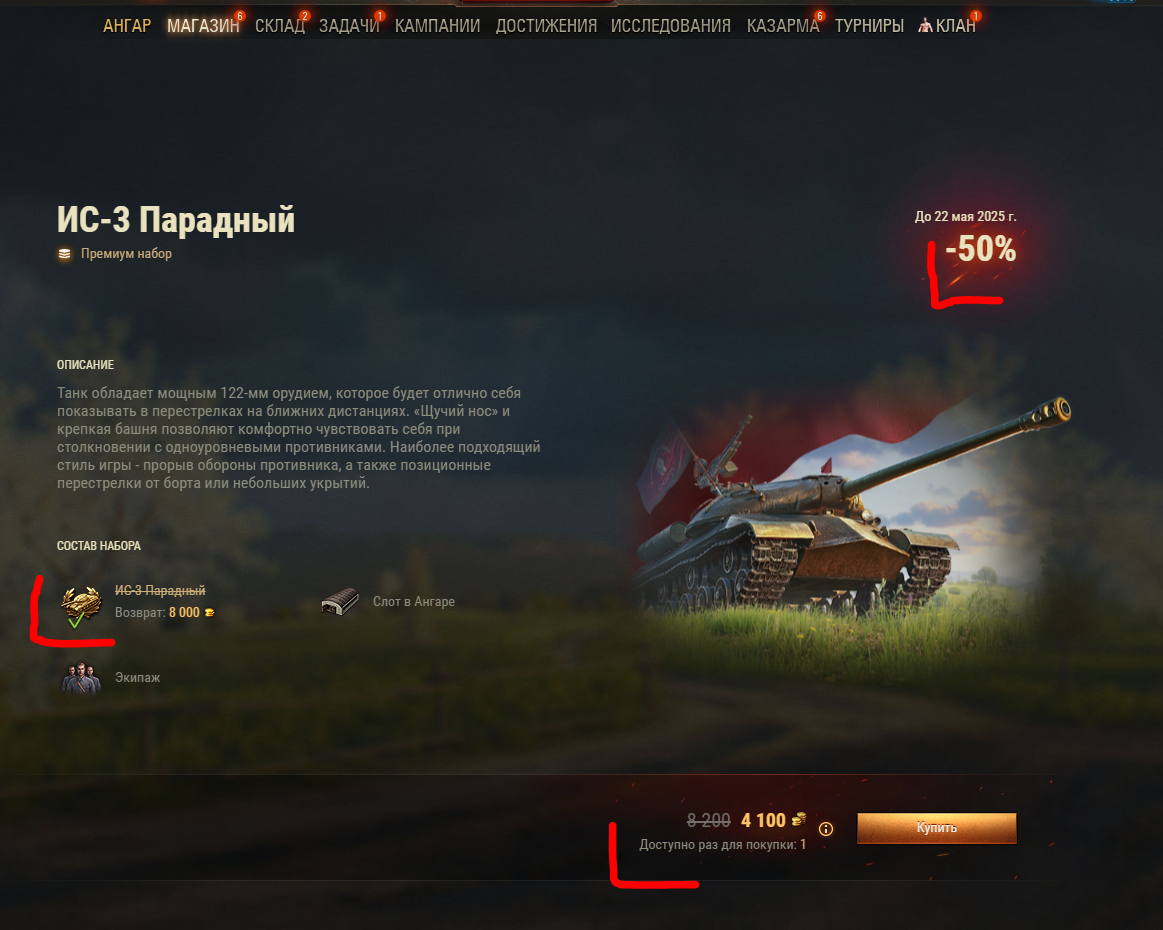 Zerguru Опубликовано: 3 мая, 2025 Игроки 3 322 публикации 78 224 боя Жалоба Поделиться Опубликовано: 3 мая, 2025 03 май 2025 - 18:02 пользователь milord_of_war сказал:так это отдельный набор на ИС-3 на которого как я понял твоя скидка с события идёт. А в наборе где 3 танка скидка на ИС-3 вряд ли будет. Покажи свою стоимость пакета большого.Скидка действительно работает только на пакет с соло ис3. Но пакет доступен к покупке даже если ис-3 есть в ангаре (собственно ты это видишь на скриншоте).Поэтому ты сначала покупаешь ИС-3 за полную стоимость в большом пакете, а затем покупаешь по итогам прохождения прогрессии пакет с соло ИС3, который будет стоить 0 и компенсирует тебе 8к голды - как на скриншоте. 1 Прошел игру, почти : (Ну, кажется кастомайз таки привезли, вычеркнем этот пункт из президентской программы 2015 года. to be continued?Пополняем каллекцию с двух коробок. Да! Ссылка на комментарий Поделиться на других сайтах Другие способы поделиться...