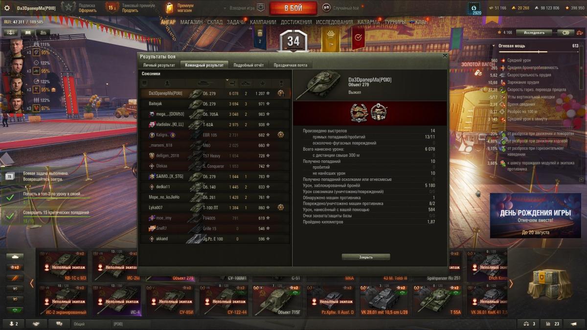 Первый бой на 279. Обычная зеленая оборудка потому что пока даже не знаю что ставить, поставил тупо снять марки зеленый вентиль, досыл и стаб. Чудовищый танк. Такое впечатление что играл против ботов, которые даже не пытаются в тебя стрелять разворачиваясь бортом чтобы стрелять в союзников. Повеселил Н3, который упорно подставлял борт и корму боясь ломов. В конце на *** решил проверить броню и выехал под жандарма подрубив абилку, чтобы ускорить перезарядку от его попаданий. Может против скиловиков будет сложнее, но я выехал тупо попробовать и думал, что буду страдать, но получилось как получилось.