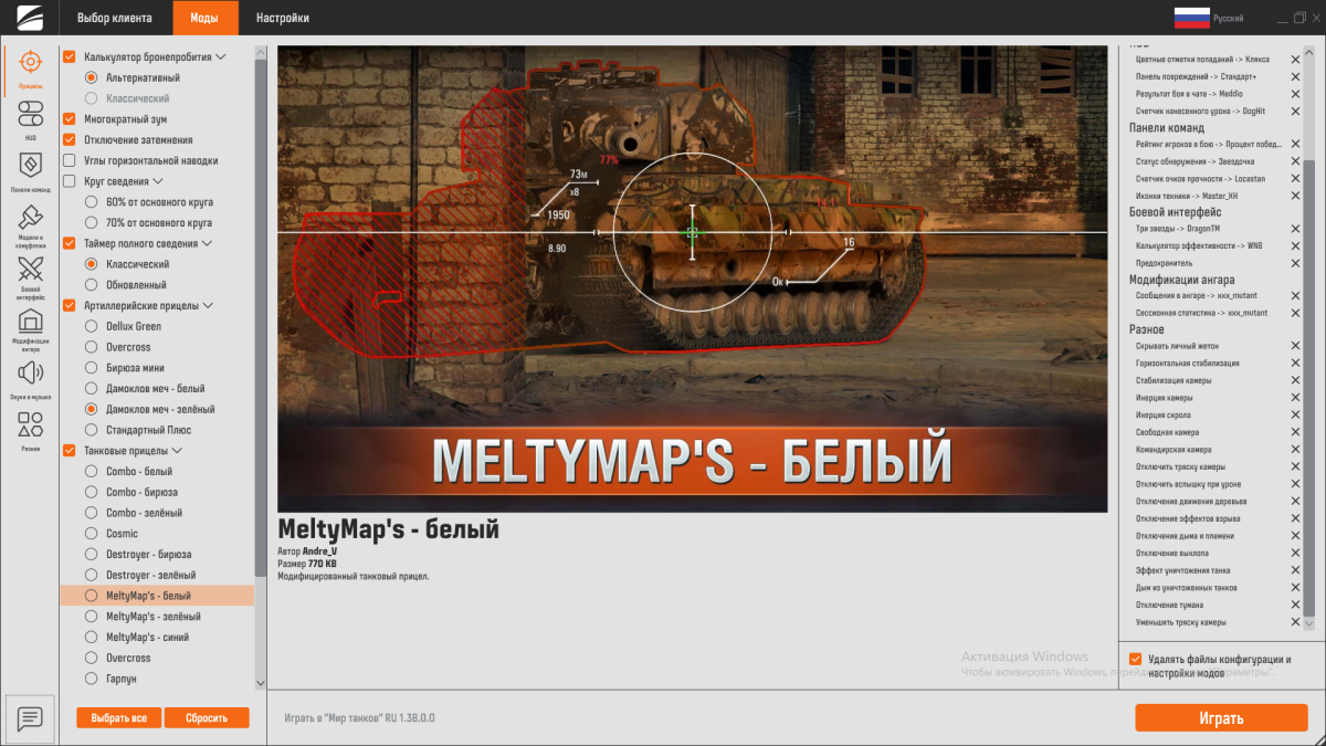 Скачал, выбрал нужные мне модификации, очень хорошие и удобные которых не видел в других модпаках. НО, не работают многие моды которые очень нужны,такие как полароид ХП+, светофор засвета, эффективность вн8, планка мастеров в ангаре, и не удобно что не отображает вн8 в списках команд по нажатию ТАБ. Помимо всего этого игра стала подвисать часто в ангаре, при каких либо манипуляциях, возможно я что-то криво поставил конечно. Модпак очень многообещающий, установщик и правда удобный, но из-за подвисаний и не работы очень нужных мне модов, пока воздержусь от использования. но буду следить за развитием.