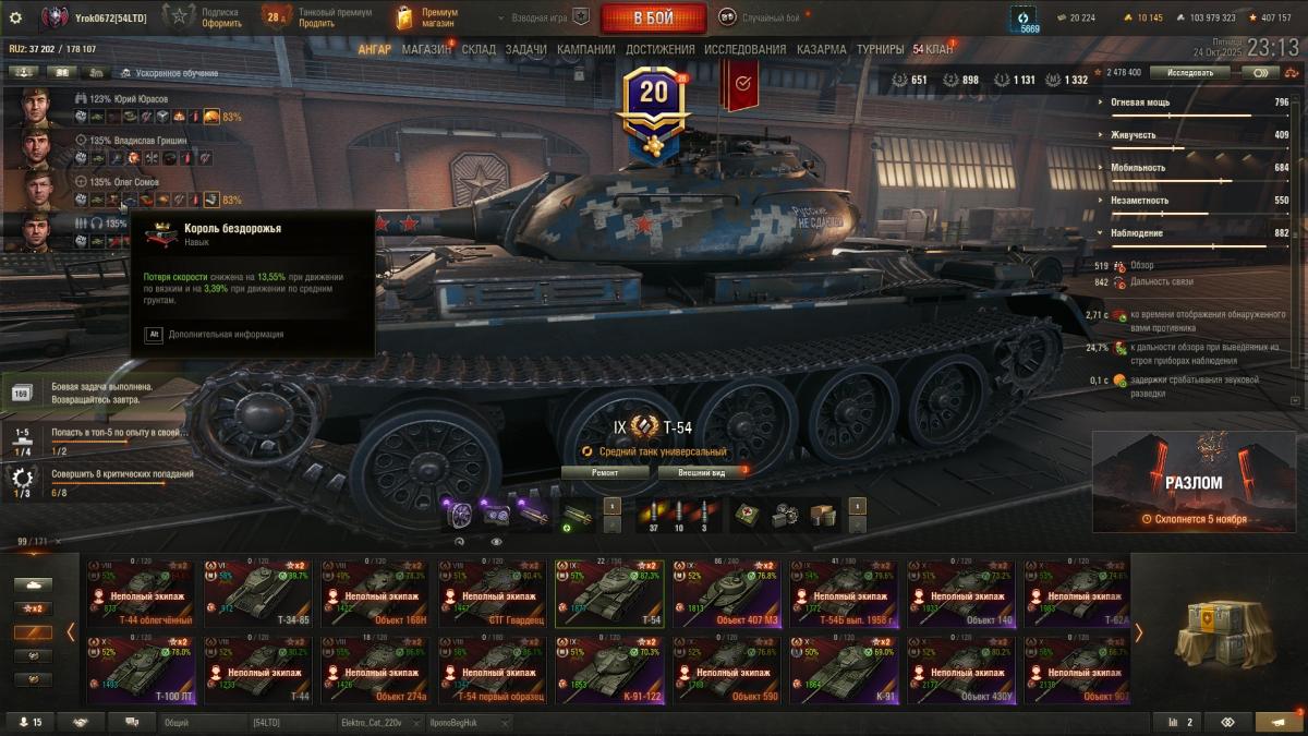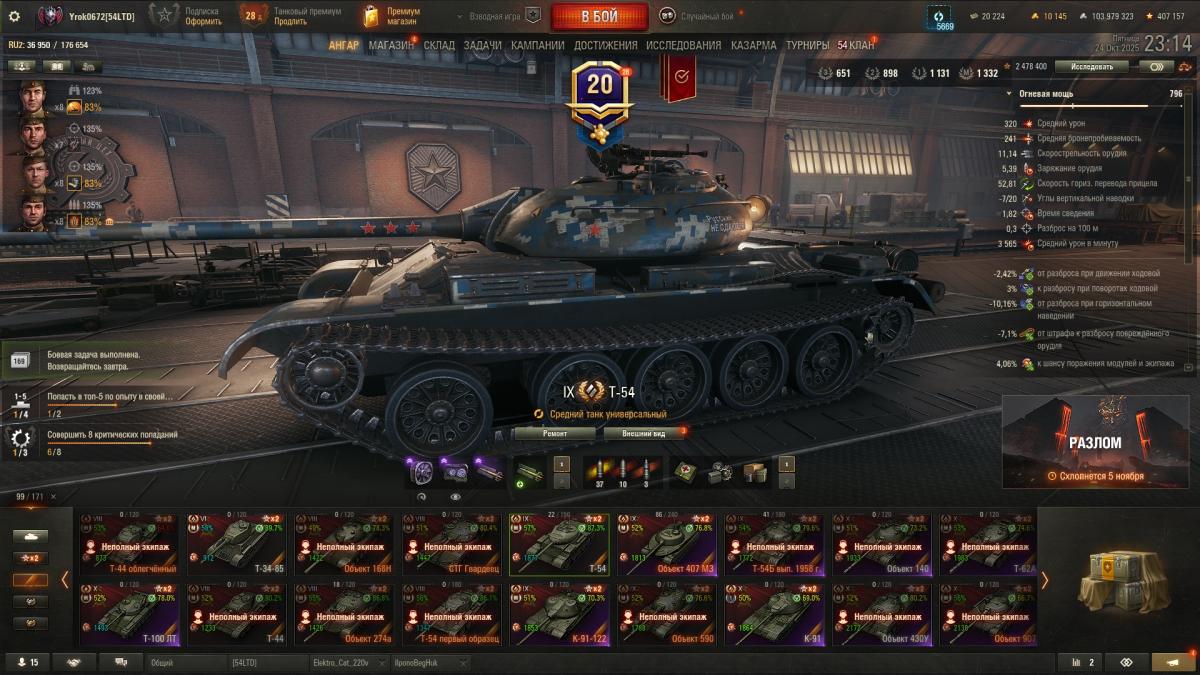 Дошли руки наконец до 54, накатал 2 отметки в охотку в рамках БП...отличный танк...трудно перестраиваться на медленные снаряды с Леопта, гсора и стандарта,  но потом все норм...только кошерную пушку я не понял, катаю на альтернативной длинностволке...она для меня более универсальная чтоль