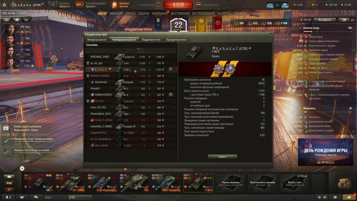 Alex_tankist_boec_metkiy Опубликовано: 8 августа, 2025 Игроки 1 480 публикаций 13 940 боёв Жалоба Поделиться Опубликовано: 8 августа, 2025 08 авг 2025 - 14:48 пользователь Amimitle сказал:Выкатил вчера 261- было с собой 5 бронебойных, все 5 попал. Это просто праздник какой-то. Вспомнил старые-добрые времена, когда от 2х ББ отлетали на перекатке Е-100. Стан и нафиг не сдался. Очень редко сажусь на арту, но тут, имхо, угадали с изменениями. Нытья " артоводов" решительно не понимаю.Говорю, лучше чуток точности, и урона дать.Как любитель арты говорю:стан не нужен.Он мешает и тем, кому прилетает(чисто пакостить, ахаха, смотри, я тебя в стане держу, ты не поиграешь), так и самому артаводу, ибо за стан ты платишь всем. Ссылка на комментарий Поделиться на других сайтах Другие способы поделиться...