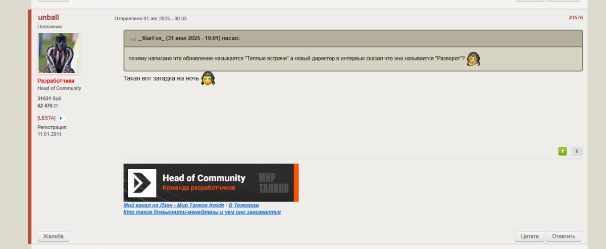 Разработчики unball Опубликовано: 6 августа, 2025 Разработчики 63 020 публикаций 33 927 боёв Разработчики Поделиться Опубликовано: 6 августа, 2025 06 авг 2025 - 22:55 пользователь _StarFox_ сказал:пять дней и ночей пришлось загадку разгадывать https://forum-mt-prod.lesta.ru/monthly_08_2025/post-11056289-0-37549900-1754510081_thumb.pngКак загадка то по итогу? ) Мой канал на Дзен / В Телеграм / TikTok / VK / MAX Кто такие Комьюнити-менеджеры и чем они занимаются Ссылка на комментарий
