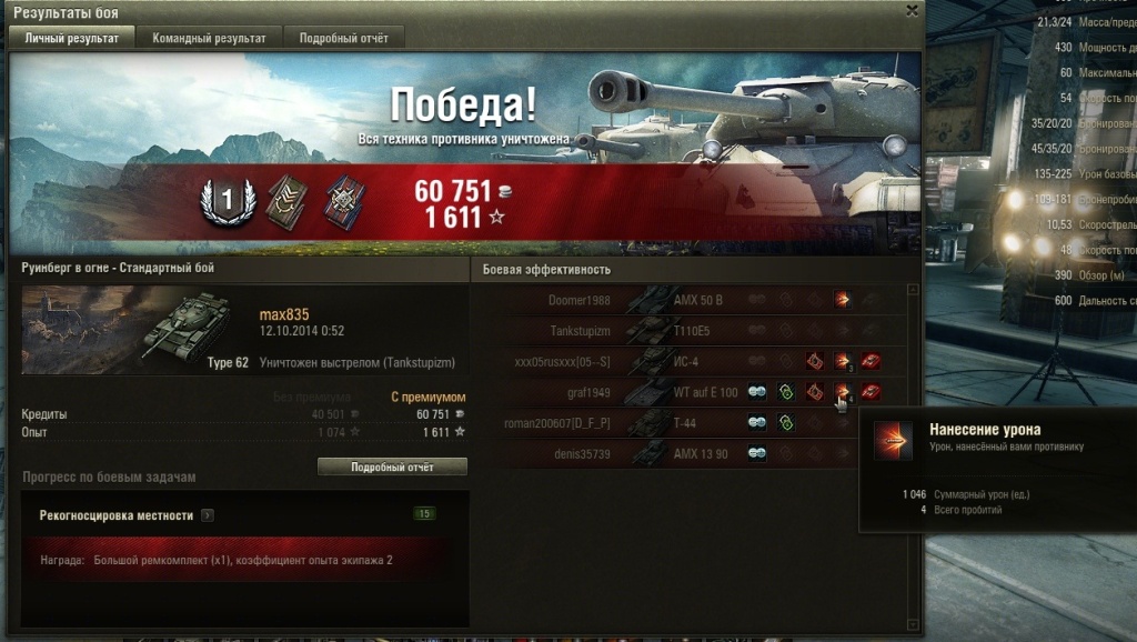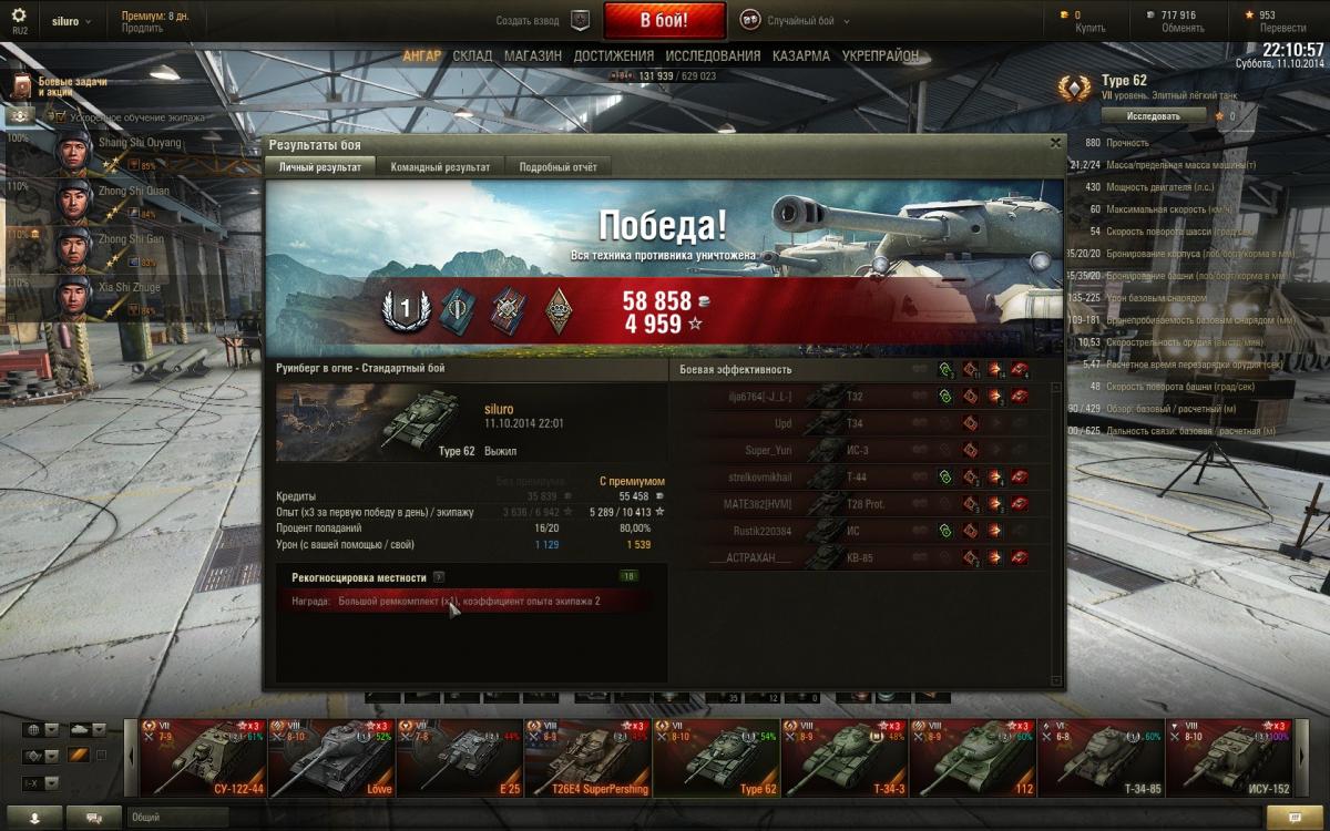 Кто там говорил, что тип62 сажает РЭшку? Вот данные последнего боя.
