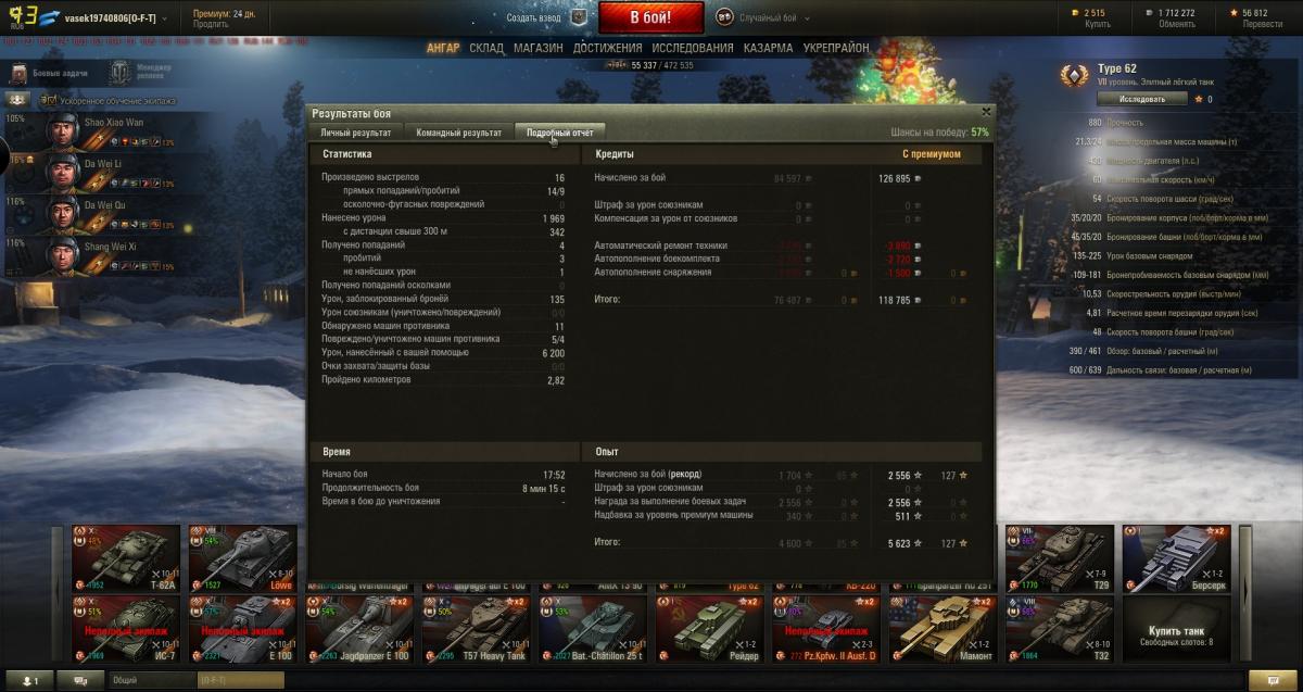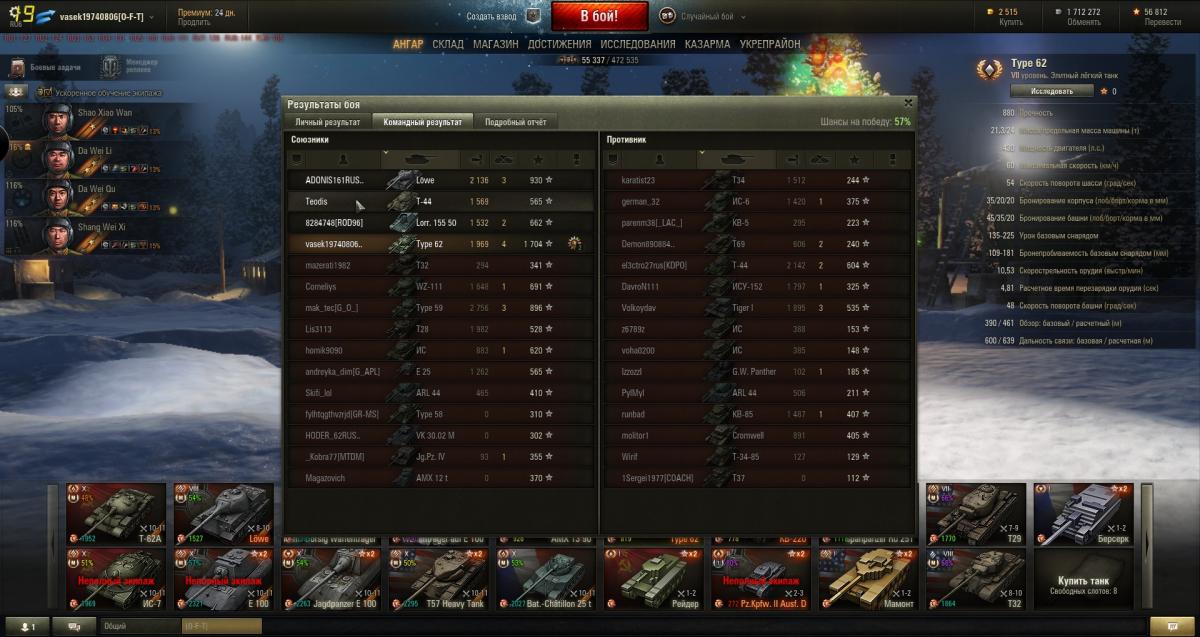 а мне нравится, когда на нем кидает 9-10 бои.противник никогда не ожидает, что от этой малютки можно получить карательный в борт или корму.и очень ругаются, когда удается кого нибудь из них забрать в ангар.а если не получается зайти в борт или корму, то либо работаю пассивным светом, либо ищу арту,пт. в целом танчик очень понравился.потому на нем максимальное количество боев среди всех танков.еще бы максировку докачать и ремонт начать вкачивать, не люблю когда гуслят.тот же МТ-25 или тип-64 не настолько впечатлили, как 62й.и суть не в уровне