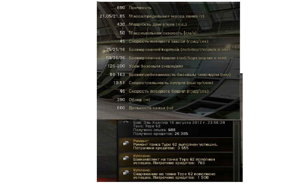 Ремонт танка Type 62 выполнен успешно. Потрачено кредитов:  3 051