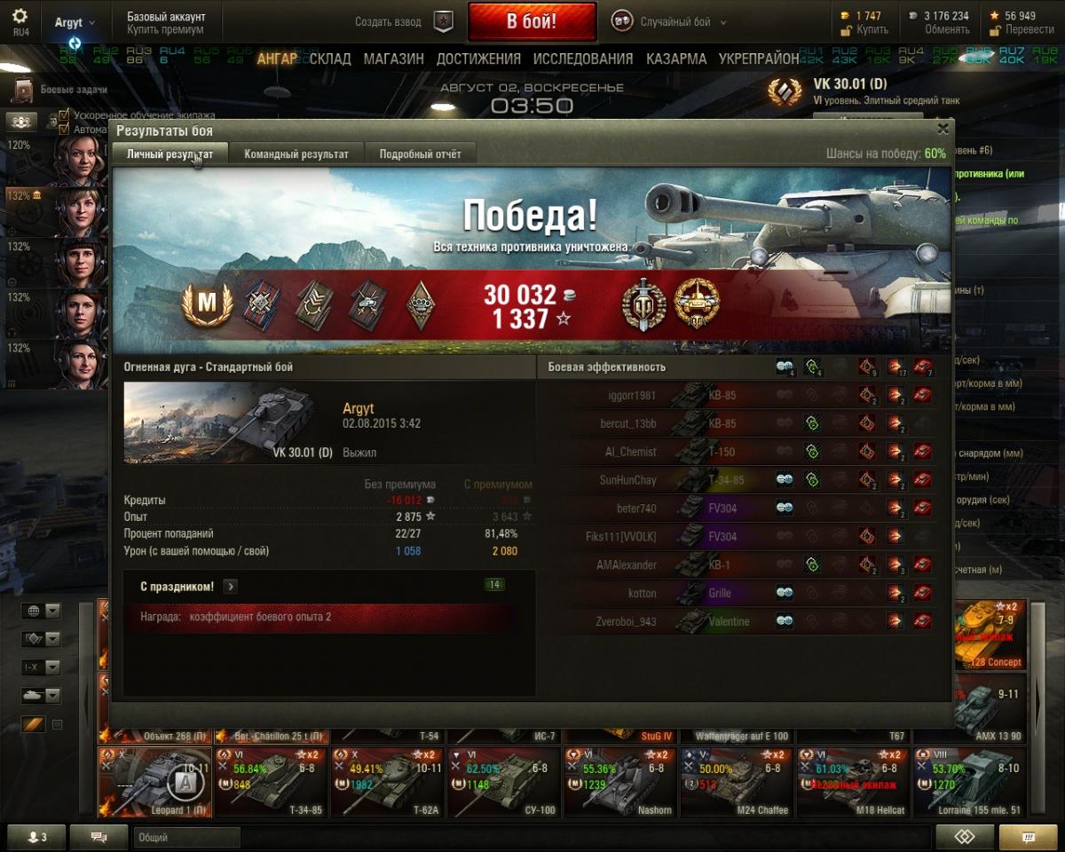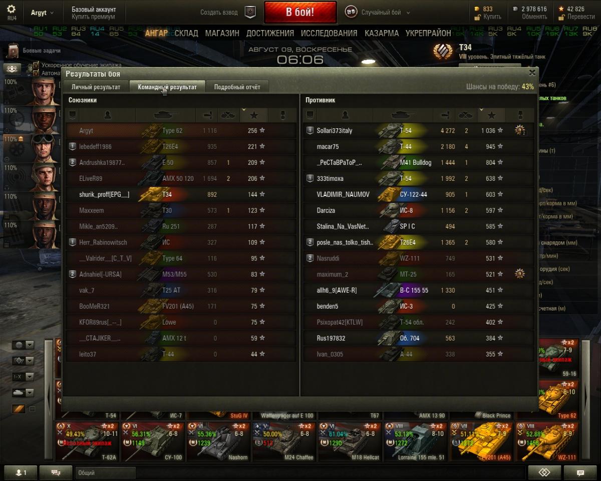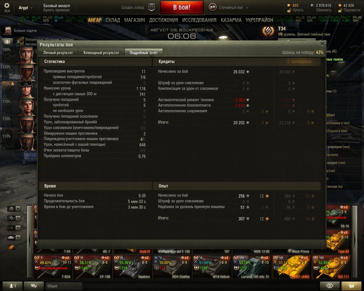 Argyt, согласен, что можно тащить и без голды, при этом хорошо зарабатывая серебро по итогам боя. Но это более актуально, когда мы в "топе". Когда же уровень боя максимальный, то чаще всего без голды не обойтись. Хотя порой у вражин попадается много всяких картонных ст и пт, но это уж как повезёт. Просто если вижу, что есть возможность повлиять на исход боя, то на толстокожих не жалею кумулей. Скажешь, что я растратный транжира? Может быть и так. Я после получения в ангар, когда начинал катать этот танк, то сначала жался на "золотые пульки", старался только светить. В итоге процент побед был ужасный. Начал вести себя больше как ст и процент пошел вверх. Естественно, экипаж подкачался и по засвету бабло стало капать лучше... :-)