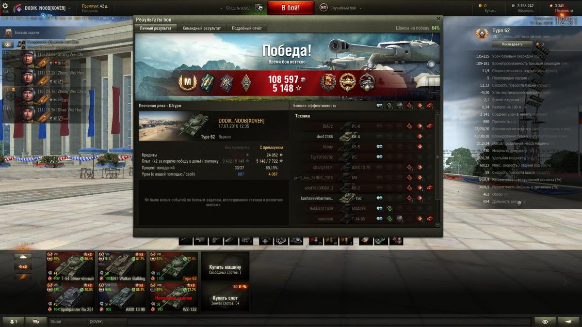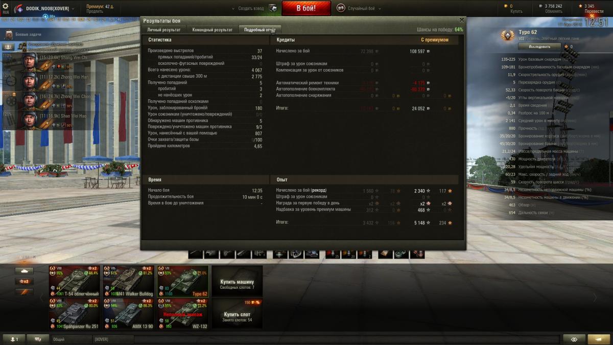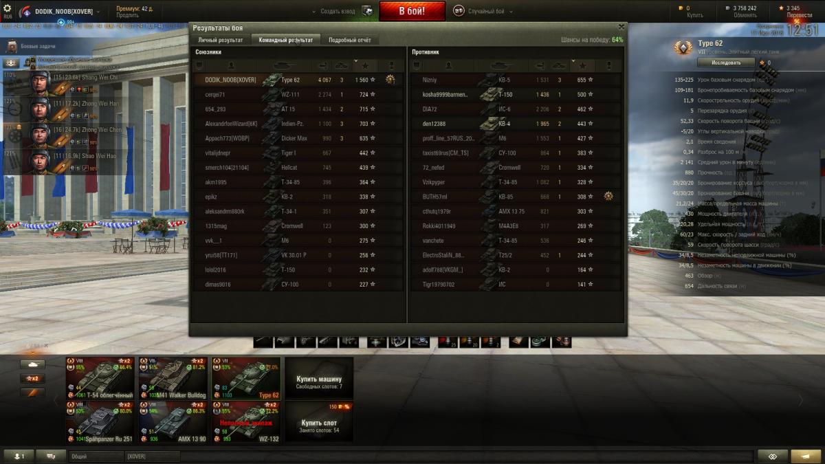 Поэтому, не надо ругать ту, или иную машину - просто одна может более-менее вытаскивать, а другая более командозависима... Хотя знаю ребят, кто на Type 62 творит чудеса... Много противоречий и обстоятельств в бою... Видимо просто не в то время я сел за комп и не та команда попалась...