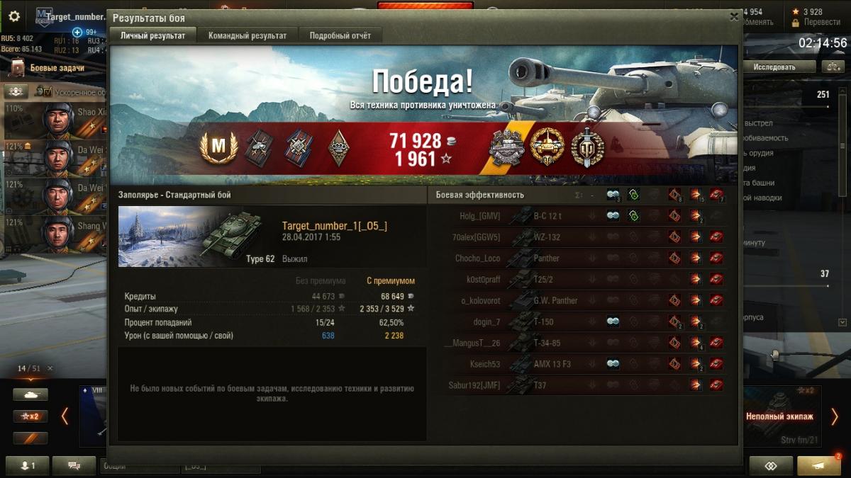 Настрелять что-то стоящее конечно можно, но к сожалению тип62 никогда особо не блистал в этой области.