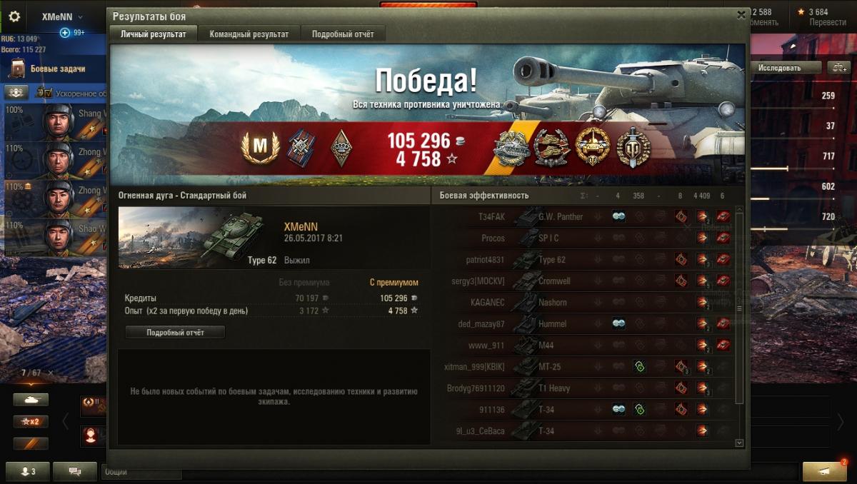 Тоже подсел назад на типа. С 46% поднял уже до 48% :great:. Очень комфортный танк стал для меня,недавно добил Обла 54 до 10-ки и тут под руку случайно подвернулся Тип62(промазал мышкой). В топе фана столько же как и от Обла ну плюс еще и немножко серебра.