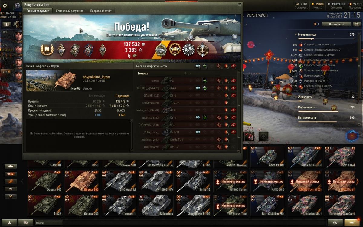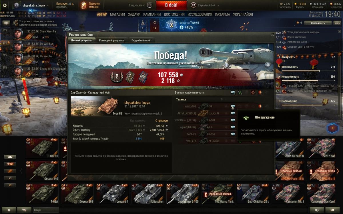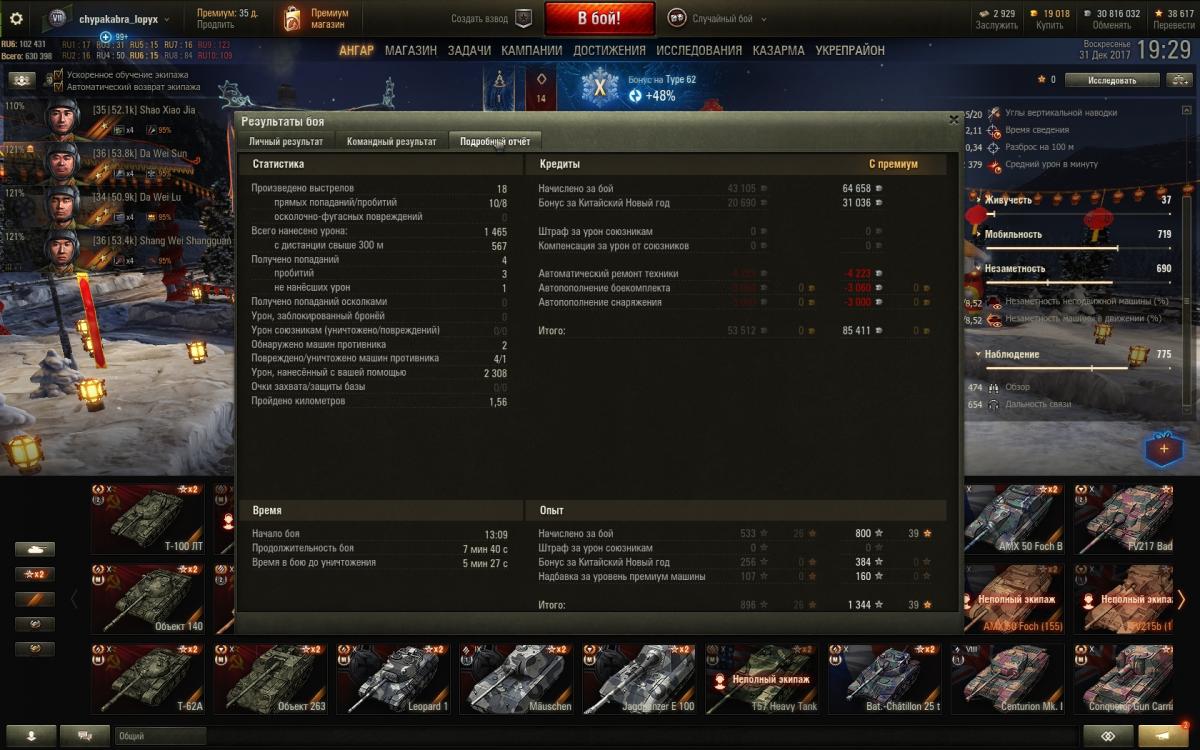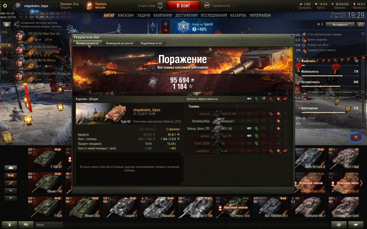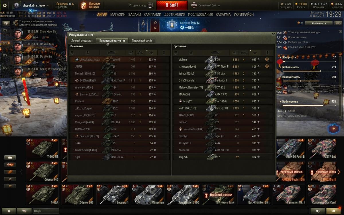 Двухдневное чтение данной ветки вдохновило на приобретение Type 62. Не знаю, ребят, в классического светляка не получается никак, всякие Борщи и иже с ними чуть ли не со своего респа высвечивают и привет. Пока пробую исполнить что-то наподобие СТ. Экипаж: четыре китайца с Type 64. По два перка (стандартно: лампа, маскировка, плавный поворот, плавный ход. Потом скину на ББ и маску). Голдовый камуфляж. По оборудованию: оптика, досыл, сведение. Пытаюсь в легкого дамагера + активный свет. К слову, на 64 чуть комфортнее, начал вкуривать его постепенно. Помимо 62 точно также не смог в Кромвеля Б. К слову, вообще ничего не качаю, просто фан. Что подскажите почитать/ посмотреть дабы понять как лучше применить 62?