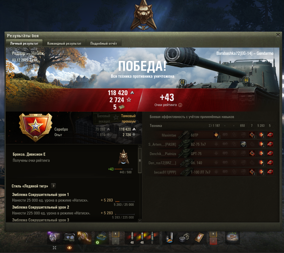 Barabashka72 Опубликовано: 3 декабря, 2025 Игроки 14 139 публикаций 68 049 боёв Жалоба Поделиться Опубликовано: 3 декабря, 2025 (изменено) Хорошо что задачки Бурунова и в Натиске делаются . Урон + фраги это нормально .https://forum-mt-prod.lesta.ru/monthly_12_2025/post-8333336-0-93778700-1764793536_thumb.pnghttps://forum-mt-prod.lesta.ru/monthly_12_2025/post-8333336-0-01915700-1764793549_thumb.pnghttps://forum-mt-prod.lesta.ru/monthly_12_2025/post-8333336-0-99734000-1764793571_thumb.pnghttps://forum-mt-prod.lesta.ru/monthly_12_2025/post-8333336-0-51799200-1764793598_thumb.png Изменено 3 декабря, 2025 пользователем Barabashka72 1 Ссылка на темку - что делать со старыми Прем танкамиASUS ROG Strix G16 Ultra 7 255hx / 5070ti 12gb /32gb ram 6400Мгц / pci-e 5.0 - 2tb wd black sn-8100+2tb Crucial P-510 / 16" QHD 240гц , 500нит Ссылка на комментарий Поделиться на других сайтах Другие способы поделиться...