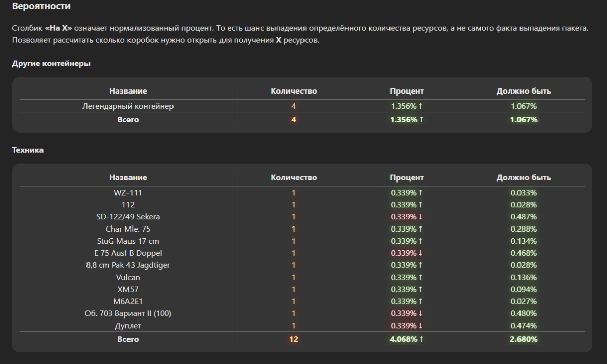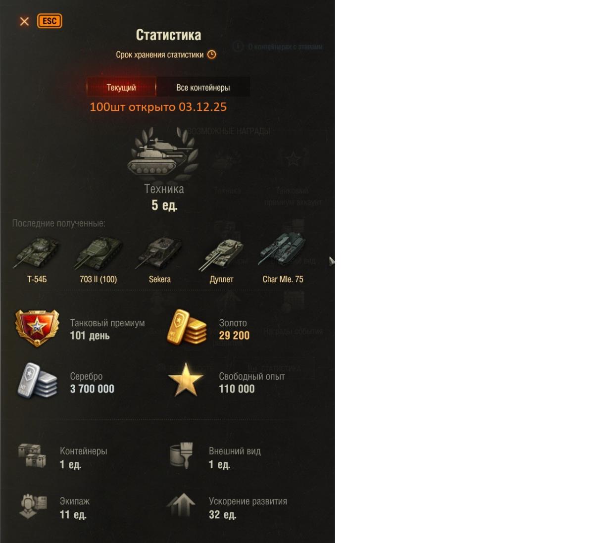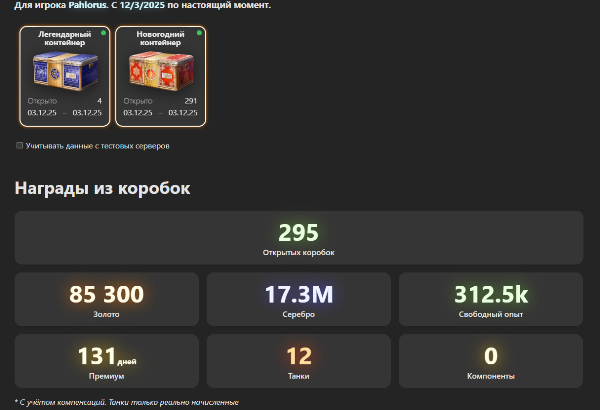 Pahlorus Опубликовано: 3 декабря, 2025 Игроки 2 886 публикаций 28 372 боя Жалоба Поделиться Опубликовано: 3 декабря, 2025 В этом году пожиже выпадабельность танков чем в прошлом, все близко к гаранту. В итоге приятных выпадений мало и картина ближе к бюджету. Но сойдет.291 корбка (3 пака+10 коробок на скидке+5 за золото). Закрылся первый этап, на втором остался не открытым только таран, до которого 20 коробок. Итого 8 танков + 4 легендарных коробка. Зато из легендарок заполучил гуся, которого хотел, остался кв5 и суперпершинг и больше там ловить нечего.Дальше жаба душит, буду моросить контейнерами за золото.https://forum-mt-prod.lesta.ru/monthly_12_2025/post-60564013-0-47157000-1764764665_thumb.pnghttps://forum-mt-prod.lesta.ru/monthly_12_2025/post-60564013-0-25055700-1764764671_thumb.pnghttps://forum-mt-prod.lesta.ru/monthly_12_2025/post-60564013-0-42736100-1764764678_thumb.pnghttps://forum-mt-prod.lesta.ru/monthly_12_2025/post-60564013-0-62042800-1764764684_thumb.png Ссылка на комментарий Поделиться на других сайтах Другие способы поделиться...