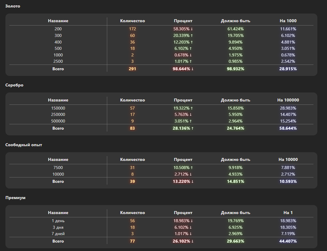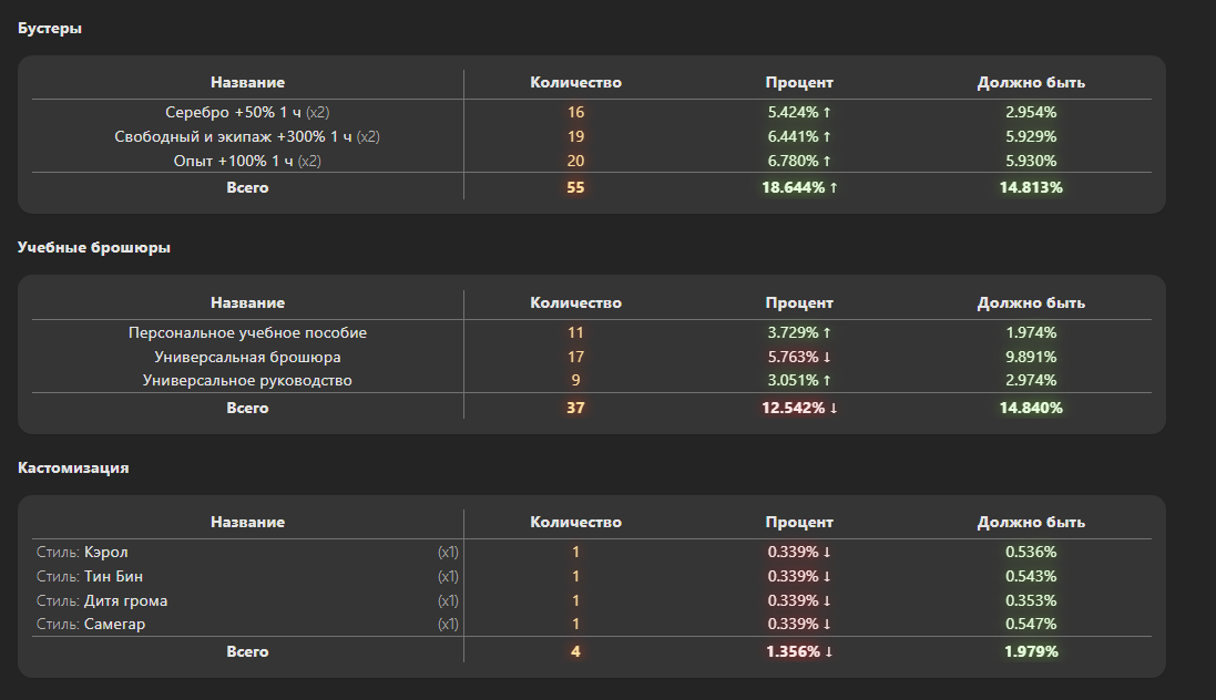 Kycaka_77 Опубликовано: 3 декабря, 2025 Игроки 6 878 публикаций 1 098 боёв Жалоба Поделиться Опубликовано: 3 декабря, 2025 03 дек 2025 - 15:25 пользователь SmEx26reg сказал:самый главный косяк статистики не добавили количество открытых контейнеров прошу пофиксить.было 2 гаранта но повезло были и с 1 и 2 коробокза 100 коробок https://forum-mt-prod.lesta.ru/monthly_12_2025/post-7674193-0-91803200-1764764687_thumb.jpgТам выше есть ответ Березки - не планируют. "При этом, информация об отношении игроков к нововведениям, не всегда означает, что эти нововведения необходимо отменять или изменять, т.к. компания не может и не обязана ориентироваться исключительно на мнение и реакцию пользователей. Это тоже надо понимать. Спасибо. " Ссылка на комментарий Поделиться на других сайтах Другие способы поделиться...