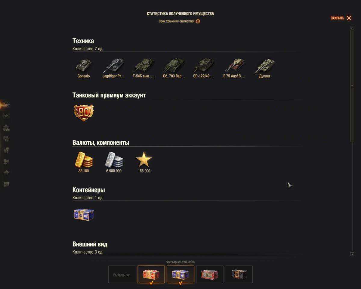 MagicForce Опубликовано: 14 января Игроки 834 публикации 33 539 боёв Жалоба Поделиться Опубликовано: 14 января итого потрачено 100млн, казна пуста)) итоги K-91-22 за 7200 бон, Скорп за 1 серебро, 25 новогодних коробок за 1 млн из которых выпали все танки 1-го этапа, все стили, ну и из 2-го этапа XM57 Ссылка на комментарий Поделиться на других сайтах Другие способы поделиться...