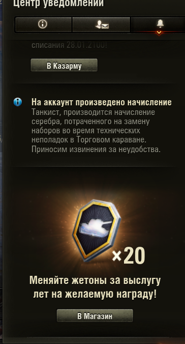 radja001 Опубликовано: 16 января Игроки 22 публикации 35 045 боёв Жалоба Поделиться Опубликовано: 16 января Мне не приходило сообщение,я не нашел его,может не увидел(вышел из игры),но серебро прислали сполна!Спасибо! Караван для меня был хорош - мне нужна была оборудка за золото и боны и я ее взял!За серебринку и серебро по мелочи как у всех наверно тоже было.Возмещенное серебро пустил на улучшение оборудования. Ссылка на комментарий Поделиться на других сайтах Другие способы поделиться...