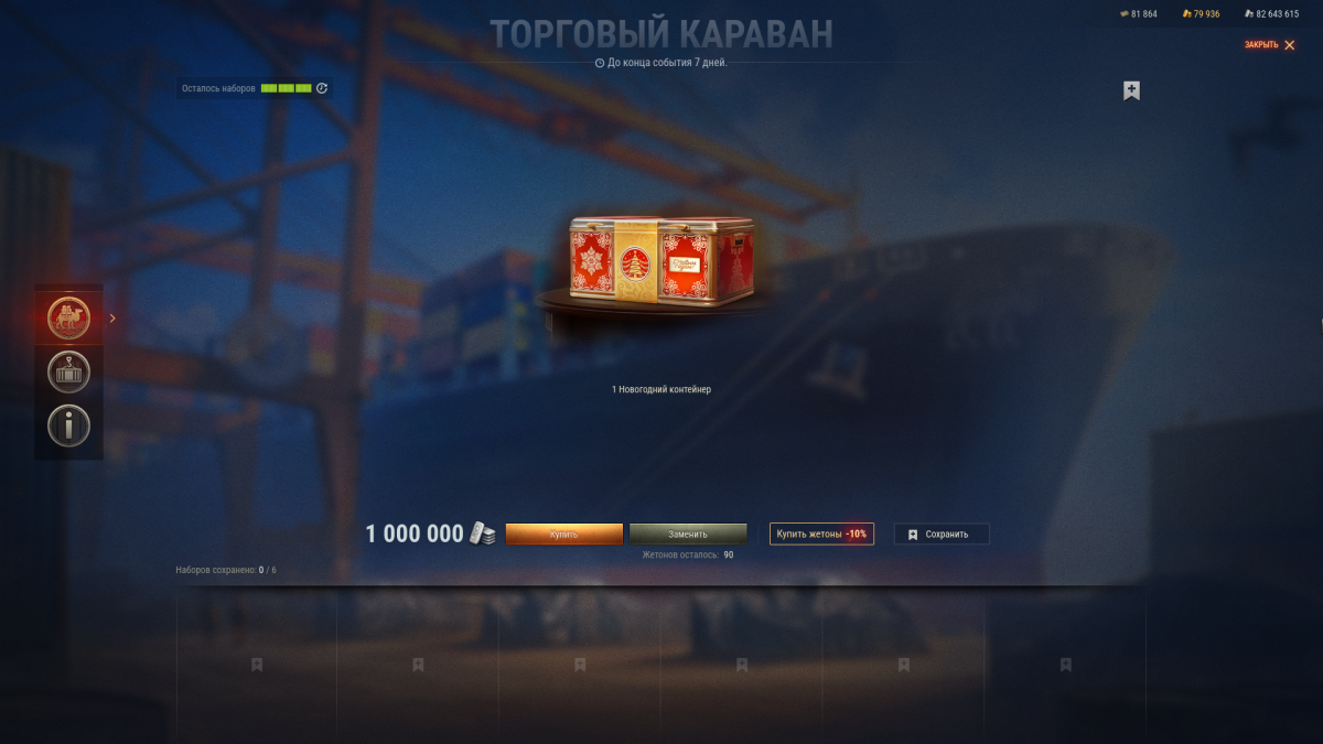 Progekt97 Опубликовано: 8 января Игроки 3 публикации 27 827 боёв Жалоба Поделиться Опубликовано: 8 января 05 янв 2026 - 14:34 пользователь Kafster сказал:Встречайте Торговый караван!https://forum-mt-prod.lesta.ru/monthly_01_2026/msg-6529509-0-71044500-1767626576.jpgС 8 января 16:00 (МСК) по 15 января 23:59 (МСК).В самый разгар праздников прибыл Торговый караван!На борту — золото, премиум танки, новогодние контейнеры, боны и множество других ценных трофеев.И самое приятное: все богатства можно получить по действительно выгодной цене и даже с персональной скидкой!Что везёт караван? Усовершенствованное и трофейное оборудование. Премиум танки в аренду на дни и навсегда! 3D-стили, среди которых – «Ниммермер» для E50 Ausf. M, «Пойнтер» для Manticore, «Гранит» для ИС-7, «Риолит» для ИС-7 и другие. Новые 2D-стили «Песчаный страж», «Холодный рассвет», «Караванный след», «Караван идёт», а также успевшие себя показать стили «Следуем курсу», «Готов к погрузке», «Караван в пути» и другие. Новогодние контейнеры. Супертовары за 1 серебро: x10 000 золота, х10 000 бон, х100 дней Премиум аккаунта, х35 Новогодних контейнеров.Список техники за 1 серебро:Lorraine 40t Rheinmetall Skorpion G Объект 252У ЛТ-432ВАЖНО!Лоты с техникой, которая уже есть у вас на аккаунте в списке доступной к восстановлению техники могут выпадать в Караване. Во время ежедневного пополнения наборов с 18:59 (МСК) до 19:01 (МСК) блок с избранными товарами может отображаться с задержкой из-за технических особенностей реализации. В это время он может быть доступен частично, либо выглядеть пустым. Пожалуйста, наберитесь терпения, сохраненные наборы не будут сбрасываться и станут видны в скором времени после завершения процедуры пополнения наборов.Жетоны события: как получить?С 6 января 9:00 (МСК) в разделе «Лучшее» внутриигрового магазина вы найдёте наборы с жетонами. Чем больше жетонов в наборе, тем больше скидка.С 8 января 9:00 (МСК), выполняя цепочку последовательных боевых задач, вы получите жетоны события, а также другие полезные награды. Полная новость. Удачных покупок, танкисты!Ну опять приходится терпеть долгую загрузку и постоянно вижу ошибку, ну вы не можете с запасом выделить ресурсы на это? Вы издеваетесь над игроками? И нормально что приходится ждать по 30 секунд загрузки задач деда мороза? Вы совсем уже ... Ссылка на комментарий Поделиться на других сайтах Другие способы поделиться...