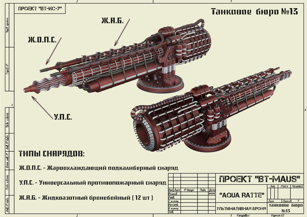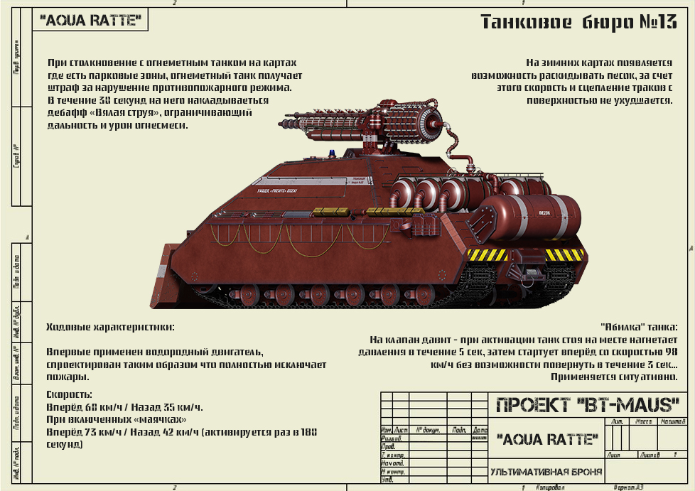 citizenfive Опубликовано: 12 февраля Игроки 305 публикаций 28 441 бой Жалоба Поделиться Опубликовано: 12 февраля 12 фев 2026 - 11:13 пользователь JIaCKoBbIu_DeD сказал:Всем доброго времени суток. Все долго этого ждали и наконец то дождались..Водометный танк Х уровня "AQUA RATTE" (На самом деле всем дела нет, но ладно ) Легенда танка: Сегодня расскажу про Х уровень водометной ветки СССР". За основу машины был взят корпус тяжёлого танка "Maus", как вы знаете было создано два прототипа,один из которых стоит в бронетанковом музее, а история второго неизвестна...Как уже писал ранее, специалисты "Танкового бюро №13" не смогли проигнорировать появления ветки "любителей гриля и копченостей", поэтому сразу же взялись за дело по созданию достойного ответа..С танком IХ уровня "ВТ-ИС-7 Щукин сын" Вы уже успели познакомиться, сегодня пришло время узнать об особенностях "Топовой машины". Топ Водометной ветки:10 уровень Водометной ветки "AquaRatte"Вооружение:Танк оснащен 3 видами снарядов:У.П.С. - универсальный противопожарный снарядЖ.О.П.С. - Жароохлаждающий подкалиберный снарядЖ.А.Б. - Жидкоазотный бронебойныйТак же пассивное умение танка, это противопожарная обработка спец.жидкостью, при приближении "Копчёных" представителей заморской ветки, спец.жидкость разбрызгивается по поверхности машины и аннигилирует воздействия огнеметов и артиллерии(Бонус). Бронирование как всегда максимальное...400 мм по кругу + экраны, естественно мы не могли сделать танк без уязвимых зон, поэтому он легко пробивается между 7 и 8 катками и в выхлопную трубу, единственное условие, танк должен быть под углом 90° к вашему танку. Ходовые характеристики:Впервые применен водородный двигатель, спроектирован таким образом что полностью исключает пожары.Скорость: вперёд 60 км/ч, назад 35 км/ч."Обилка" танка: На клапан давит - при активации танк стоя на месте нагнетает давления в течение 5 сек, затем стартует вперёд со скоростью 98 км/ч без возможности повернуть в течение 3 сек..Применяется ситуативно. Экипаж: 8 человек3 основных члена экипажа, остальные вахтовики. Всем добра. "Секретный чертежи":"Чертеж орудия""Рендеры танка"какой глубокий анализ и знание своего дела, Вы наверно потратили много времени в архивах, занимаясь поиском информации. мое уважение, а разрабам стоило бы поучиться работе с архивами, а не просто гуглить.... Ссылка на комментарий Поделиться на других сайтах Другие способы поделиться...