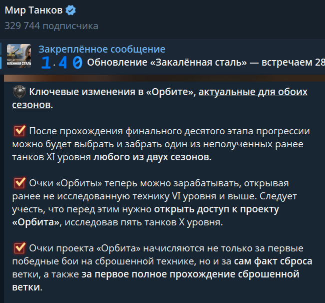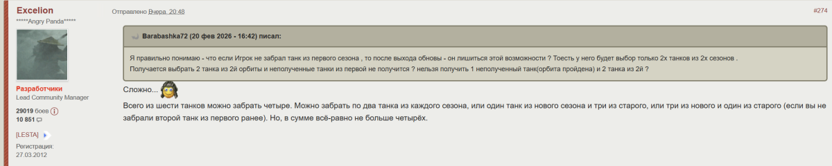 JustHoi Опубликовано: 6 марта Игроки 1 439 публикаций 61 740 боёв Жалоба Поделиться Опубликовано: 6 марта 06 мар 2026 - 17:36 пользователь Barabashka72 сказал:ты про это написать не забудь после выхода Обновления После прохождения финального десятого этапа прогрессии можно будет выбрать и забрать один из неполученных ранее танков XI уровня любого из двух сезонов . Любого одного из 2х сезонов - не из 2го сезона . Это читается как - ты получишь на выбор ДВА танка в общей сумме ) не вижу в новости - что игрок в сумме может получить 3 танка также не вижу в новости - Игрок не получавший ранее ни одного танка но прошедший первую орбиту - может получить 4 танка после прохождения 10 этапов не вижу в новости что игрок ранее не получивший ни одного танка может Без прохождения орбиты-2 получить Даже 1 танкСейчас на ТЕСТЕ можно получить только 2 танка , вне зависимости от того пройдена у тебя первая орбита , получал ли ты танки ранее или не стал выбирать . Почему бы Лесте не озвучить что бы игроки не потеряли ( до ОРБИТЫ-3) один танк , если они прошли Орбиту и не получили пока ни одного ? А таких будет много . Почему бы просто не запостить - что бы игроки поторопились с выбором хотя бы одного танка за первый сезон ? Написать куда? Санитарам, что у них пациент убежал?Еще раз, для пожилых. Раньше на 10 уровне сезона орбиты ты выбирал только из неполученных танков текущего сезона. Сейчас - из неполученных всех сезонов. Ссылка на комментарий Поделиться на других сайтах Другие способы поделиться...