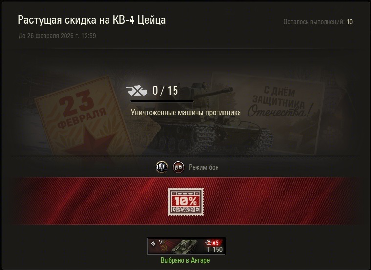 Разработчики Kafster Опубликовано: 18 февраля Разработчики 1 097 публикаций 57 796 боёв Разработчики Жалоба Поделиться Опубликовано: 18 февраля С Днём Защитника Отечества!От всей души поздравляем с днём отваги и мужества!Команда «Мира танков» желает вам крепкого здоровья, новых побед и точных выстрелов — сегодня и всегда.Впереди целая программа праздничных активностей: от нового премиум танка до щедрых бонусов. А сейчас подробнее о том, что вас ждёт в игре. С 19 февраля 09:00 (МСК) по 26 февраля 09:00 (МСК).Главное и самое приятное: промокод!23FEBRUARY2026Внутриигровые бонусы и скидки: Дополнительный опыт за первую победу Опыт x5; Перевод свободного опыта в опыт экипажа Опыт экипажа 1 к 25; Обучение/переобучение экипажа Золото и Серебро 25%; Смена специальности экипажа Золото 25%; Сброс навыков и умений экипажа Золото и Серебро 25%; Перевод опыта в свободный Золото 1 к 35; Койки в казарме Серебро 50%; Слоты Серебро 50%; Штатное оборудование Серебро 50%; Штатное снаряжение Серебро 50%; Скидка на премиум танки СССР 2-8 уровней Золото 23%; Скидка на все исследуемые танки СССР 5-10 уровней (кроме сверхтяжёлых штурмовых танков СССР) Серебро 23%; Скидка на все коллекционные танки СССР 5-10 уровней Серебро 23%; Скидка 23% на премиум технику СССР в премиум и внутриигровом магазинах.Боевые задачи для настоящих Защитников: Задача:ИнструктажВыполняется на технике 4 уровня и выше Случайные бои, Генеральное сражение 1 раз на аккаунт Сыграть бойНаграда:1 день танкового премиум аккаунта x1 марка «День защитника Отечества»Задача:Боевые стрельбыНа аккаунте есть 1 марка «День защитника Отечества» Выполняется на технике 4 уровня и выше Случайные бои, Генеральное сражение 1 раз на аккаунт За любое количество боёв заработать 1 000 ед. чистого опытаНаграда:x2 Предбоевая инструкция для экипажа «Искусство сбивать пламя» x2 Предбоевая инструкция для экипажа «Укрытия на местности» х2 Предбоевая инструкция к оборудованию «Продувка воздуховодов» х2 Предбоевая инструкция к оборудованию «Рациональная боеукладка» x1 марка «День защитника Отечества»Задача:Оборона рубежейНа аккаунте есть 2 марки «День защитника Отечества» Выполняется на технике 4 уровня и выше Случайные бои, Генеральное сражение 1 раз на аккаунт За любое количество боёв нанести 2 500 ед. урона по технике противникаНаграда:x3 Большой огнетушитель x3 Большая аптечка x3 Большой ремкомплект x1 марка «День защитника Отечества» Задача:КонтратакаНа аккаунте есть 3 марки «День защитника Отечества» Выполняется на технике 4 уровня и выше Случайные бои, Генеральное сражение 1 раз на аккаунт За любое количество боёв уничтожить 5 танков противникаНаграда:x3 Личный резерв +50% к опыту за бой на 1 час x3 Личный резерв +200% к свободному опыту и опыту экипажа за бой на 1 час x1 марка «День защитника Отечества» Задача:Решающий бойНа аккаунте есть 4 марки «День защитника Отечества» Выполняется на технике 4 уровня и выше Случайные бои, Генеральное сражение 1 раз на аккаунт За любое количество боёв 15 раз попасть в топ-10 по опытуНаграда:х1 2D-стиль «Лесной защитник» x2 Личный резерв +50% к серебру за бой на 1 часНовинка! Сверхтяжёлый КВ-4 Цейца. Получить нового сверхтяжёлого красавца вы можете с 19 февраля 09:00 (МСК) по 05 марта 09:00 (МСК) тремя способами: Приобрести его в Премиум и Внутриигровом магазинах за деньги или золото. Получить его в качестве приза при использовании специального п