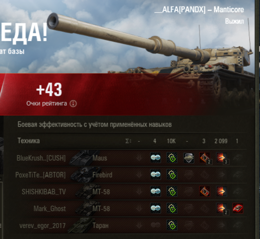 xViTuSx Опубликовано: суббота в 15:43 Игроки 62 публикации 14 366 боёв Жалоба Поделиться Опубликовано: суббота в 15:43 28 мар 2026 - 05:48 пользователь __ALFA сказал:карта химки. кто победил?такой валидольный бой. 20260328_1231_uk-GB100_Manticore_Onslaught_04_himmelsdorf.mtreplay 1,48МБПомню свои первые шаги в натиске в каком-то из медведей, кажется.Где то на 4-5 бой, может даже ещё в квалификации, на ИС-4 гонялся за вилкой по карте Степь. И базу она мне брать не давала и догнать я не не мог.Вышел из режима и вернулся только спустя год в него. Ссылка на комментарий Поделиться на других сайтах Другие способы поделиться...