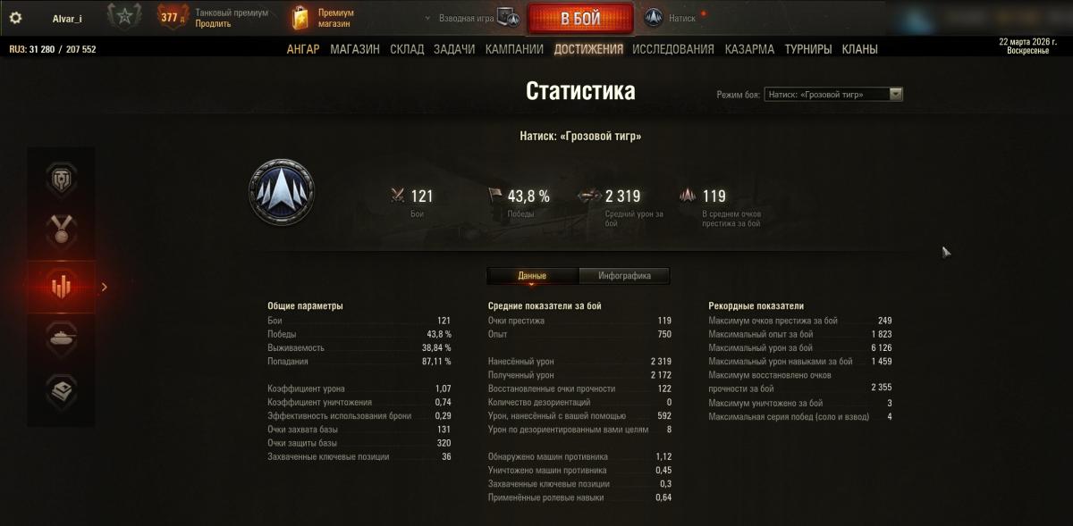 Alvar_i Опубликовано: 22 марта Игроки 474 публикации 40 459 боёв Поделиться Опубликовано: 22 марта 22 мар 2026 - 09:30 пользователь TAKCA__BAKCA сказал:Зря про неуважаемых. Режим лучше рандома (лично для мене).....вот наверное соглашусь, с учетом что 10ки теперь по кд корм для 11 уровней, то Натиск хорошая такая отдушина поиграть на любимых танках. я чтото в начале раскатал губешку "вот дойду накатом до золота, а там приятный камфанцер возьму...."угу х... там..... хорошо что БП качается ударными темпами и на том спасибораз пошла такая песня свои достижения выкладывать как выше у уважаемого jk45422 мар 2026 - 08:16 пользователь jk454 сказал:... смотрю на свои и начинаю чтото понимать, что по крайней мере делает человек не так, раз у него такие результаты относительно моих.... но и у меня пока шарики с роликами не сходятся, а как надо? чтобы было лучше... подскажите кому не лень ,буду признателен Ссылка на комментарий Поделиться на других сайтах Другие способы поделиться...