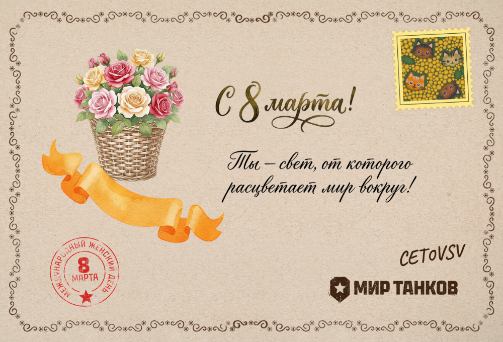 taleyko20 Опубликовано: 6 марта Игроки 9 162 публикации 118 200 боёв Жалоба Поделиться Опубликовано: 6 марта Всех с Наступающим Праздником и Удачи на полях сражений! МИР ТАНКОВ, это Самая лучшая игра в мире!Поддержка любимой игры и всех настоящих Счастливых игроков на форуме! Ссылка на комментарий Поделиться на других сайтах Другие способы поделиться...