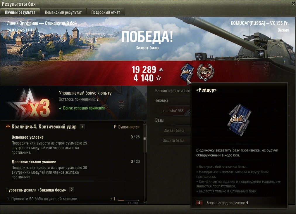 Da3DpanepMa Опубликовано: 24 марта Игроки 8 836 публикаций 51 209 боёв Жалоба Поделиться Опубликовано: 24 марта 24 мар 2026 - 11:28 пользователь _KOMUCAP сказал:Прикольно,Рейдер.Самая позорная медаль в игре, хотя для арты норм. Ссылка на комментарий Поделиться на других сайтах Другие способы поделиться...