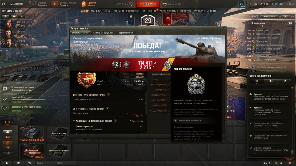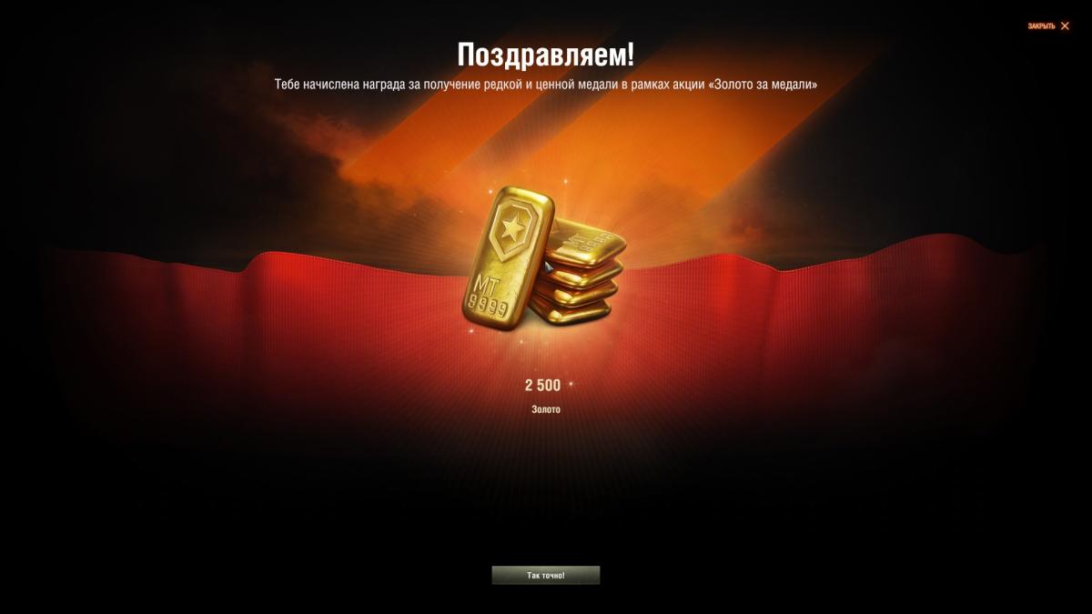zinzilj70 Опубликовано: пятница в 19:48 Игроки 7 080 публикаций 76 020 боёв Жалоба Поделиться Опубликовано: пятница в 19:48 27 мар 2026 - 22:41 пользователь neDaJIb_nonyTaJI сказал:Вообще медалька не приметная. Взял горынача, чтобы фармить Старка, а вот когда дали 2500 голды было удивление, ибо это уже явный просчет лесты)Я тоже катал ради старка. Потом так же неожиданно получил контрбатарейную стрельбу и 100 голды за неё. После этого уже решил проверить остальное и хладнокровного выполнял уже специально. Хотя надежд особо не было, ибо старков на нём за 1800+ боёв было больше 130, а хладнокровный лишь один. Но это потому что я за лт никогда не гонялся на нём, а не потому что столь невыполнима. Ссылка на комментарий Поделиться на других сайтах Другие способы поделиться...