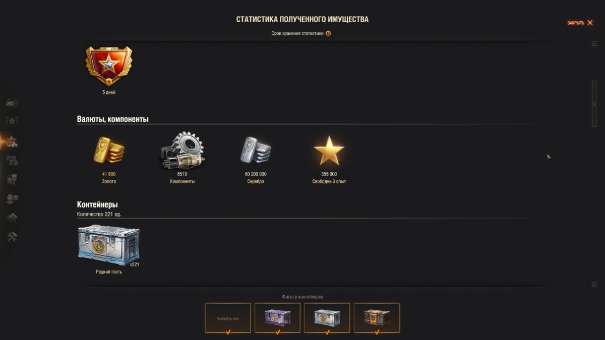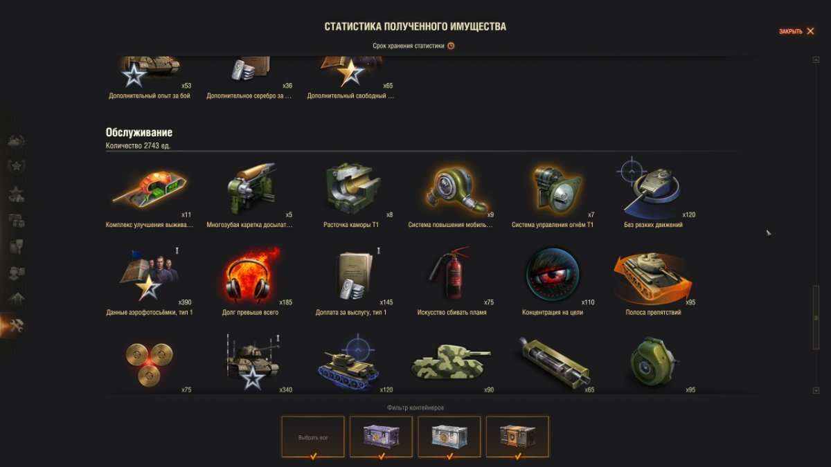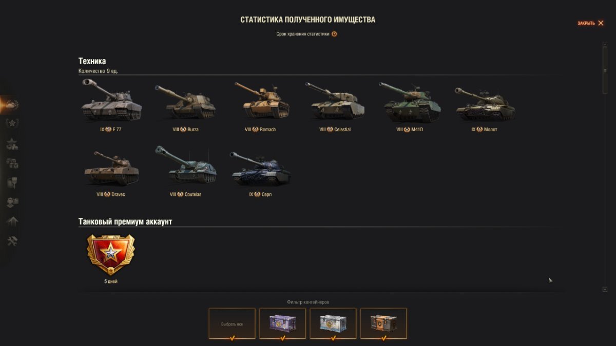 Mark_7_7_7_ Опубликовано: 16 апреля Игроки 54 публикации 20 505 боёв Поделиться Опубликовано: 16 апреля С 221 контейнера редкий гость выпали почти все танки (168 М ,рудный барон неокрашенные были ,был об 265Т) ивент прошёл успешно !Сколько коробок приобретал не считал,но гораздо менее 1000. На твинк без единого боя с 20 простых коробок выпал Серп и Ромах. Скрытый текст Ссылка на комментарий