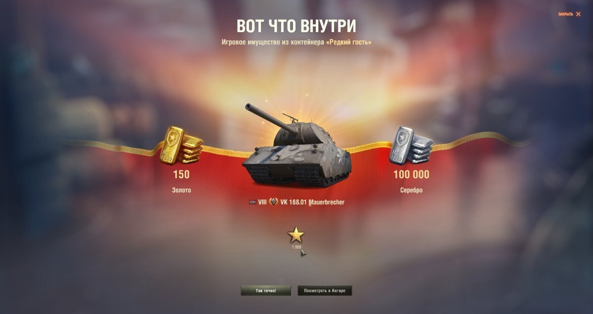 KABKA3_HA_TAHKE Опубликовано: 17 апреля Игроки 8 208 публикаций 60 866 боёв Поделиться Опубликовано: 17 апреля (изменено) посчитал статистику полученных 27 "Гостей" (пылесосил все коробки за серебро и свободку, не смог получить три халявные коробки в марсоходах... 3 (три) коробки Гостя "недополучено"не выпали до 20% :-( ) Если Вы везучий как большинство, то с 1 "Гостя" Вам вернут: 170 голды, 1500 свободки, 250 000 серебра (в том числе учебными материалами). Будет 9 декалек, скин не выпадет. Ну, оказалось что Я очень везучий и мне выпала ПТ франции. 41 до гаранта стало. Теперь стало жаль тратить свободку. :-) Буду испытывать муки выбора :-) Да пребудет с вами здравомыслие!!! Изменено 17 апреля пользователем KABKA3_HA_TAHKE 15 х5 для M56 Scorpion, Rheinmetall Skorpion G, Panzer 58 Mutz, M46 Patton KR, M 41 90 GF — в подарок , который заканчивается 20 октября (уже) Человеки, будьте людями : дарите подарки - подарками насовсем ( на, со всем ) , а не пару месяцев 19.09.2017 СТГ Гвардеец и 22.09.2017 Chrysler K GF - задачи на x5 опыта - Задача бессрочная Ссылка на комментарий