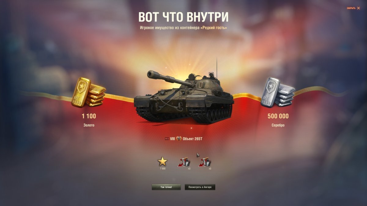 Stanislav_khab_ Опубликовано: 17 апреля Игроки 321 публикация 300 боёв Поделиться Опубликовано: 17 апреля Азаза! Сегодня с 10 ежедневных бесплатных коробок выпало 5 редких, а из них Объект 265Т. Найс! Халявный прем ТТ, плюс 1100 голды. 2 Ссылка на комментарий