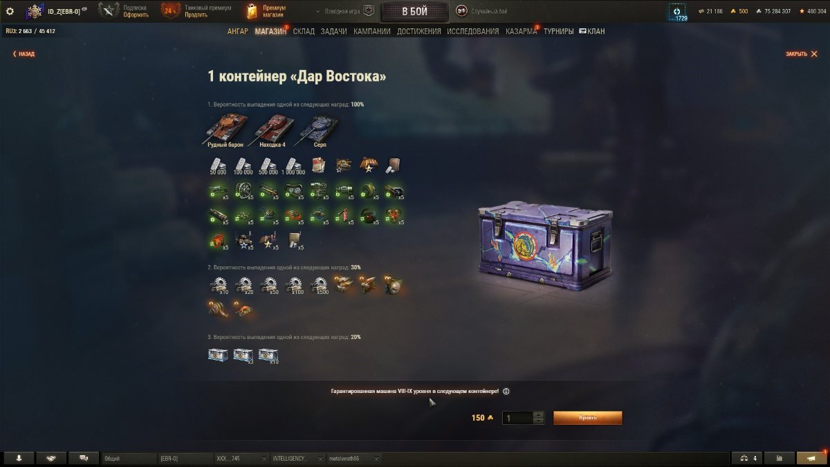 ACID_DRINKER Опубликовано: 17 апреля Игроки 2 151 публикация 908 боёв Поделиться Опубликовано: 17 апреля 3 минуты назад пользователь Psychopat сказал: Котлета и ромашка Это тебе (с чем тебя и поздравляю, Ромашка неплохой танк), а вот что выпало Калибру_230?.. Со скольки коробок, кстати? Мне сегодня с десяти Востоков выпали две редкие, в редких - 300 голды, 6000 экспы и серебра чуток. 37 осталось до гаранта. "Ответственные лица ложат болт" (с) Ссылка на комментарий