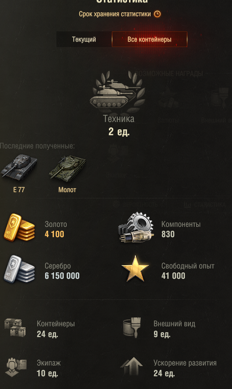 Ruslantos1 Опубликовано: 19 апреля Игроки 100 публикаций 12 117 боёв Поделиться Опубликовано: 19 апреля Покупал коробки только за серу и свободку по скидки. По итогу на сегодня 2 танка (молот на 1 редкой коробке, е77 на 29-й). Нафармил золота и компонентов, только по свободке -50к. Спасибо. За золото дальше естественно ничего докупать не буду. Скрытый текст Ссылка на комментарий