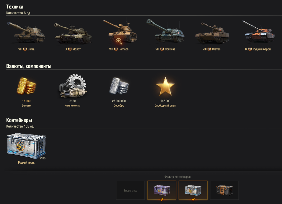dimontankist01 Опубликовано: 20 апреля Игроки 1 публикация 33 271 бой Поделиться Опубликовано: 20 апреля Сегодня, купил на твинке 11 контейнеров за голду. С них выпало 7 редких контейнеров, и 2 танка. до этого оставалось 30 до гаранта. повезло. на основном еще не одного танка и 29 до гаранта. Скрытый текст Ссылка на комментарий