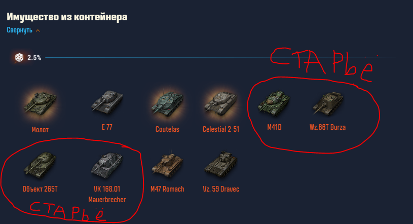 Pet_Nik3 Опубликовано: 7 апреля Игроки 125 публикаций 11 424 боя Поделиться Опубликовано: 7 апреля 16 часов назад пользователь SlyerPRO сказал: Мне эти новые танки особо и не нужны, у меня много прем танков 8 и 9 уровня, и не на всех даже поиграть успел. Куда их столько? Просто чтоб были? А так оно и получается, играю максимум на 8 из нескольких десятков имеющихся. А вот свободный опыт и боны это самые ценные награды для меня, ну и прогресс БП тоже. А еще б давали выбор приоритета, допустим, мне танк ваш не нужен и даже компенсация за него. Сделайте возможность выбрать приоритет. Например, я ставлю галочку на свободный опыт, боны и оборудование, осознанно отказываюсь от возможности выпадения танка и повышаю шанс на выбранные категории наград. Нужно побольше декалек с резервами - хороших и разных Ссылка на комментарий