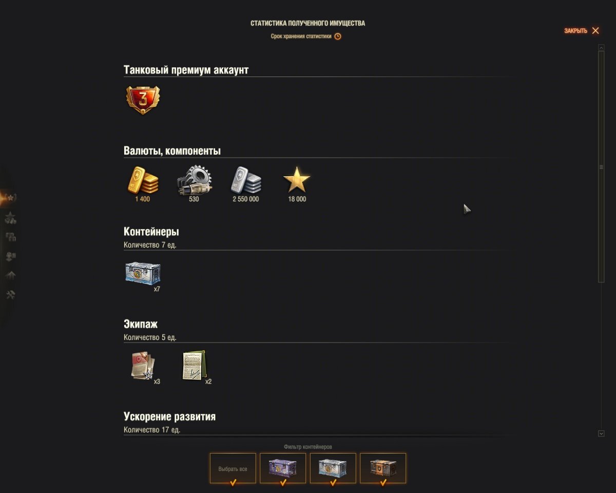 ikercas Опубликовано: 10 апреля Игроки 4 227 публикаций 47 163 боя Поделиться Опубликовано: 10 апреля Максимально нищие коробки, сегодня с 15 коробок - 2 редких гостя = 100000 серебра, 150 золота, 1000 свободного опыта. выдаёт минималку почти каждый редкий гость. Дары востока постоянно напоминают мне, что Долг превыше всего. Дайте возможность продать эти инструкции за полцены. 2 Цитата Sergeyca сказал: 1. Иногда на это есть необходимость, иногда нет. Опросы приходят игрокам и сейчас, в том числе по режиму Натиск. Для получения статистически значимых данных не обязательно опрашивать всех, если аудитория достаточно большая, то при правильной выборке результаты оценки будут точны и похожи на опрос всех пользователей, при этом затрачивается меньше ресурсов и времени, это позволяет сконцентрироваться на качестве анализа, а не на его объеме. Это нормальная и повсеместно используемая практика. 2. И сейчас -"Боров", ничуть не выбивается из стилистики "кличек" всех остальных предыдущих. Боровом называют крупных и очень сильных мужчин, что в целом, можно сказать и про наш новый танк Об. 278 3. Нашей целью было сделать контейнеры данного запуска - выгоднее предыдущего. Убежден, что у нас это получилось. Скоро проверим. Sandi_b сказал: Дроп оборудования не был порезан. Это лишь ваши догадки и ощущения, которые вы выдаете за действительность Ссылка на комментарий